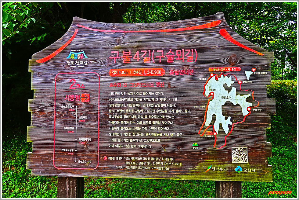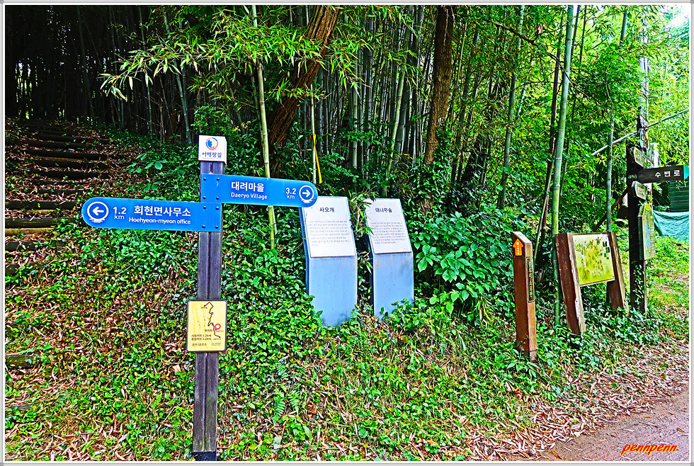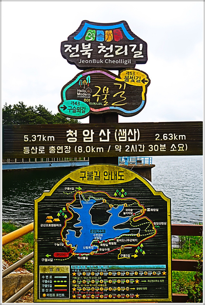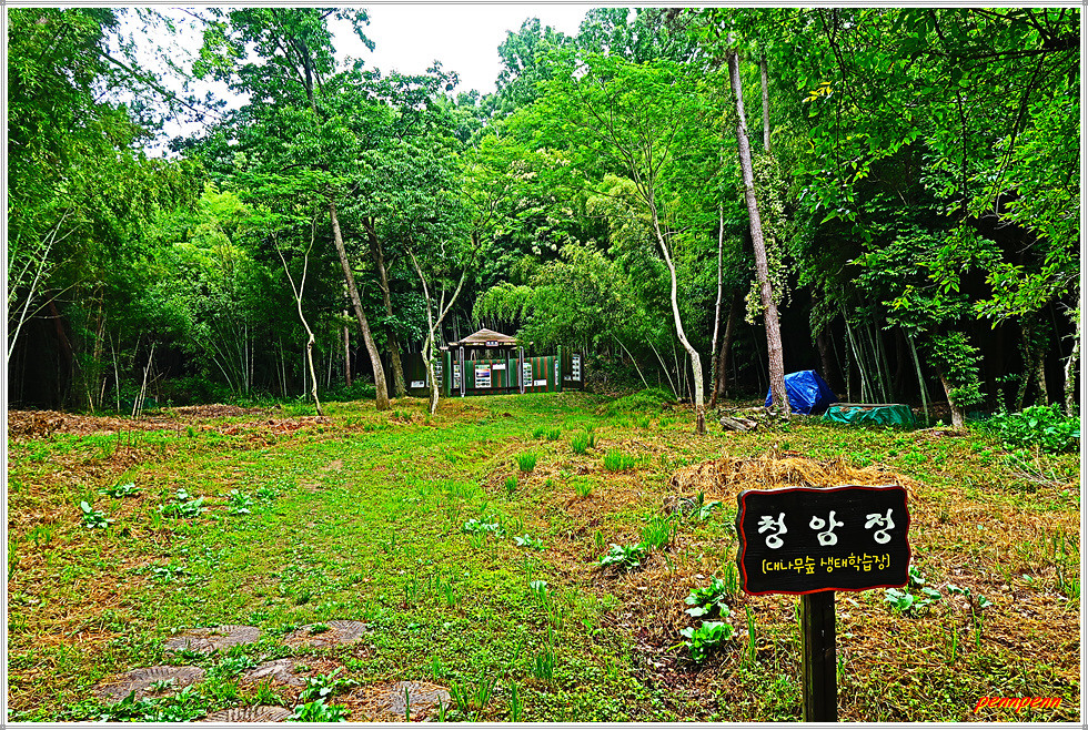 이제부터는 군산호수 둘레길을 걷습니다. 길목에는 구불길을 알리는 안내문이 자주 보입니다. 숲속의 길은 정말 청량하군요. 가끔씩 바라보이는 호수의 모습도 그림 같습니다. 대나무숲 생태학습장에는 청암정이라는 정자가 세워져 있습니다. 이제부터는 대나무숲이 본격적인 모습을 드러냅니다. 맞은편에서 오는 둘레길을 걷는 이들을 종종 만나니 반갑군요.