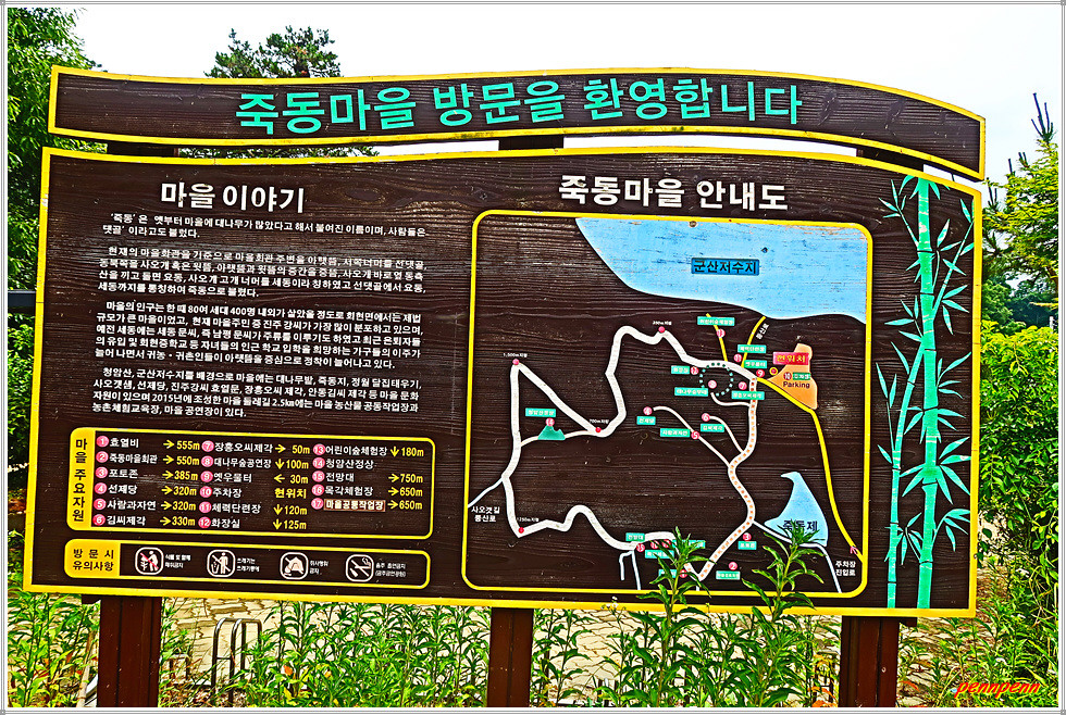 산돌교회와 회현초등학교를 지나 북쪽으로 계속 가면 청암산 주차장이 있는 죽동마을입니다. 죽동마을은 이름 그대로 예로부터 대나무가 많이 붙여진 이름으로 댓골이라고도 부른답니다. 청암산 입구에는 사오갯샘이 있는데 안내문은 너무 낡아서 기독성이 떨어집니다.