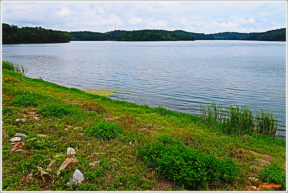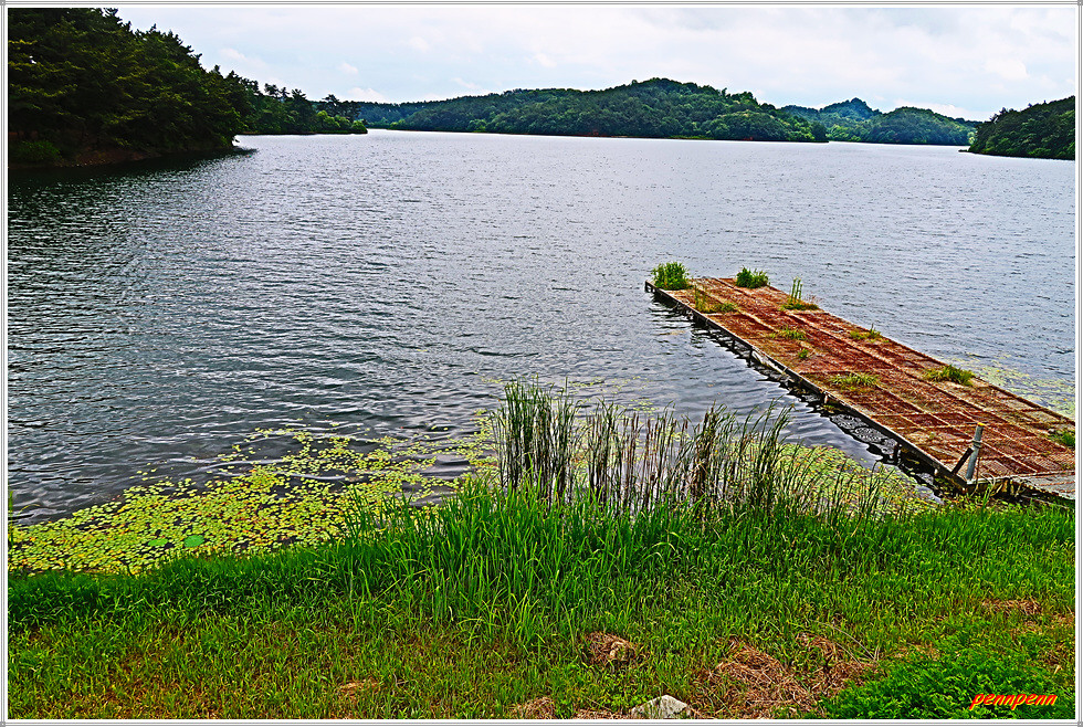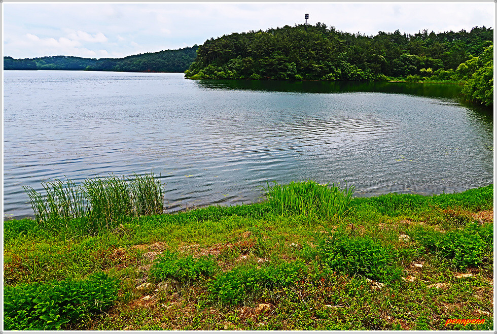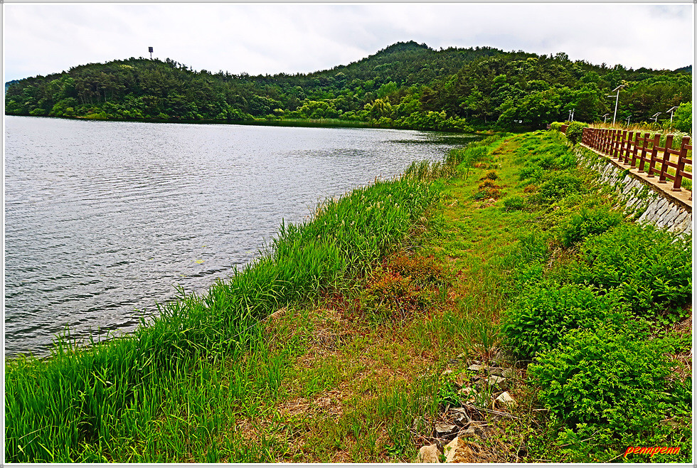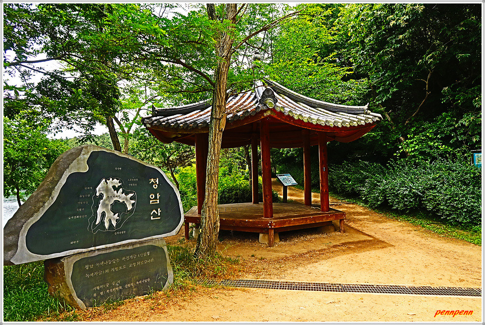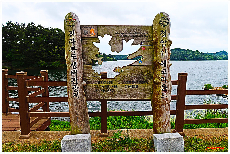 드디어 군산호수 제방입니다. 정자 옆에는 청암산 표석이 세워져 있군요. 군산시 회현면 소재 군산호수는 청암산(119m) 북쪽에 있는 호수로 청암산 일대는 일제강점기인 1939년 수원지로 조성되었으며, 1963년 상수원 보호구역으로 지정된 후 2008년 지정해제 될 때까지 45년 동안 생태계가 그대로 보존되어온 곳입니다. 호수주변으로 군산호수 둘레길이 조성되어 있는데, 둘레길은 보존 가치가 높은 다양한 습지식생환경으로 야생 동식물의 중요한 서식처이기에 학생들의 자연학습 장소로도 제격입니다.