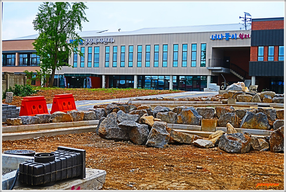 잠시 후 북쪽으로 방향을 돌려 회현면사무소를 향해 들판사이를 걸어갑니다. 모내기를 한 벼는 6월의 하늘아래 무럭무럭 자라고 있네요. 광지산 마을표석을 뒤로하고 발걸음을 옮기나 길섶에 붉은 병꽃나무가 길손을 반겨줍니다. 지성어린이집은 동화나라 공주가 사는 궁전 같은 모습이로군요. 회현교회와 회현면보건지소를 지나니 회현사거리에 있는 회현면사무소입니다.