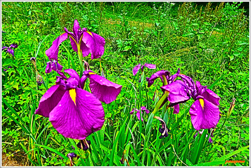 안으로 들어서니 대나무숲이 있는데 이곳 사오개는 청암산 남쪽 자락의 고개입니다. 이곳에는 군산호수 주변으로 청암산 탐방코스 안내도, 청암산 에코라운드 안내도, 전북천리길에 속하는 구불4길(구슬뫼길) 종합안내판 등 각종 안내지료와 함께 반듯한 화장실도 보입니다. 특히 좀처럼 보기 드문 꽃창포가 피어 있네요.