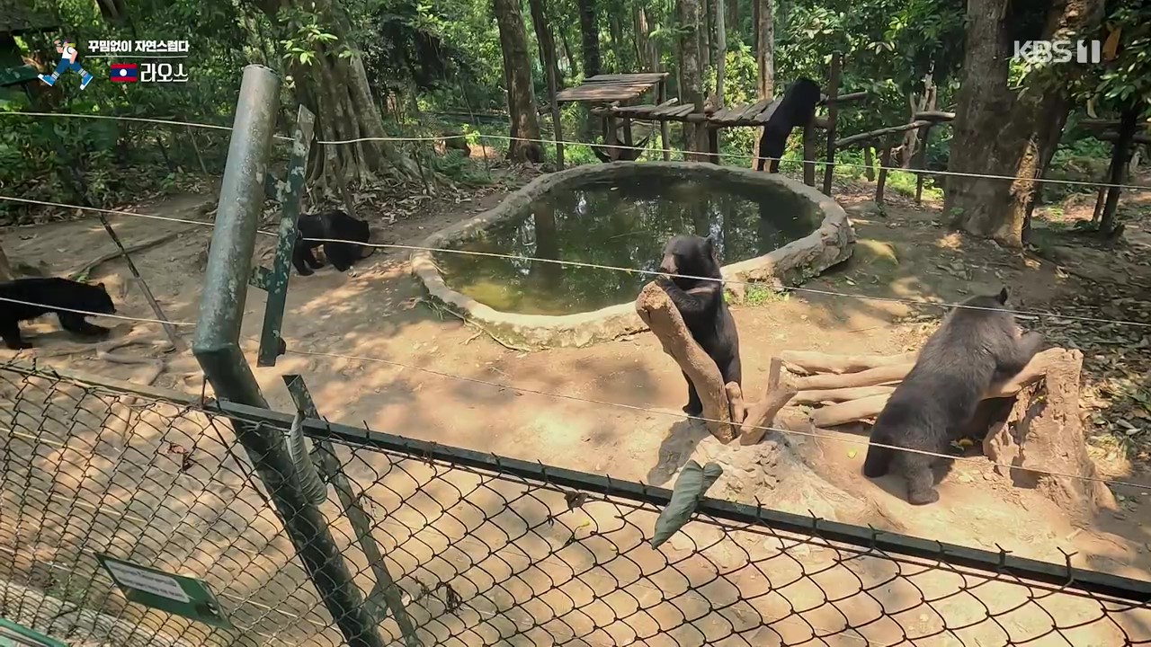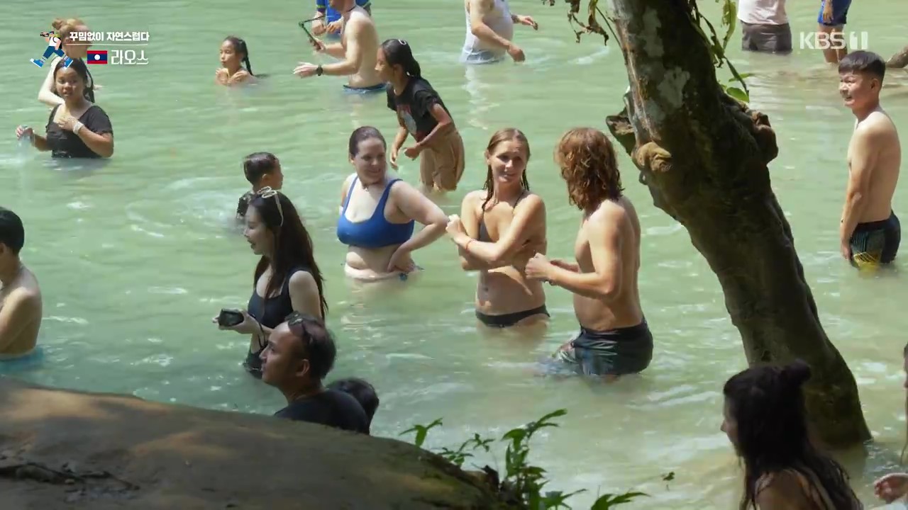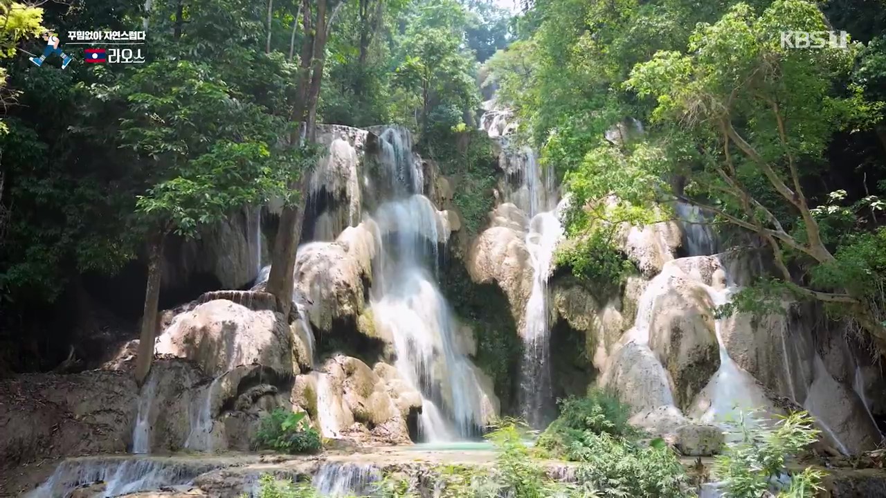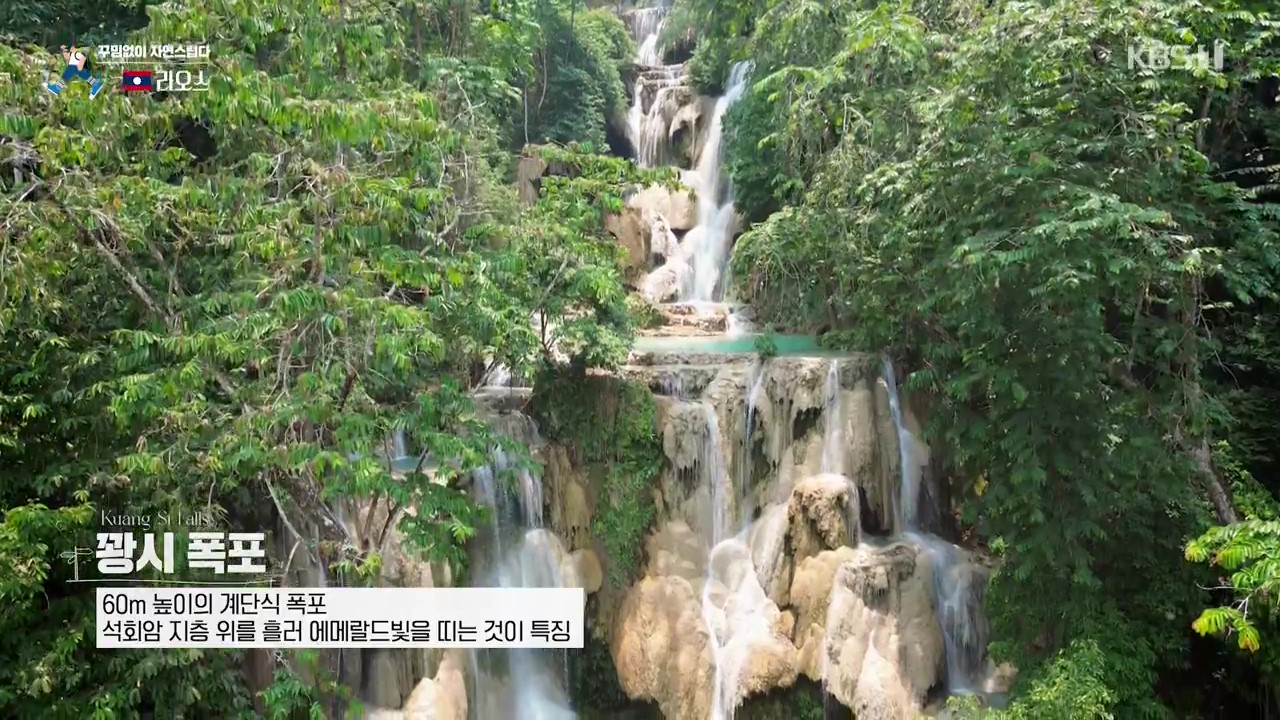 꽝시폭포로 가는 길목에는 놀랍게도 우리나라 멸종위기종인 반달가슴골 7마리가 보호되고 있더군요. 사육사는 곰에게 호박, 오이, 파인애플, 옥수수 등을 사료로 먹입니다. 꽝시폭포는 높이가 60m에 달하는 계단식 폭포입니다. 사람들이 이곳을 찾는 이유는 바로 아래에 다이빙을 할 수 있는 천연 수영장이 있기 때문입니다.