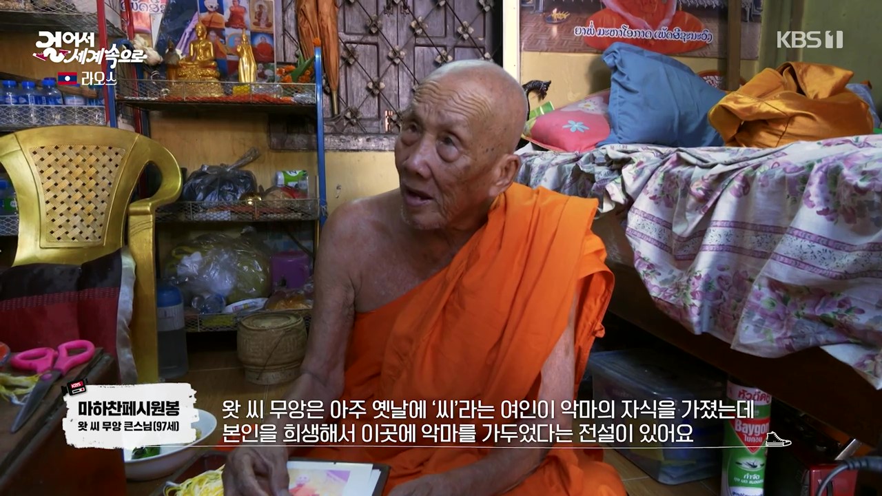 수도 비엔티안은 라오스 여행의 관문도시입니다. 왓씨 무앙 사원은 비엔티안의 어머니 사원으로 불리며 도시의 수호신으로 여겨지는 기둥이 있습니다. 사람들은 여기서 소원을 빌면 이루어진다고 믿습니다. 큰 스님의 연세가 97세인데도 목소리가 카랑카랑하네요.
