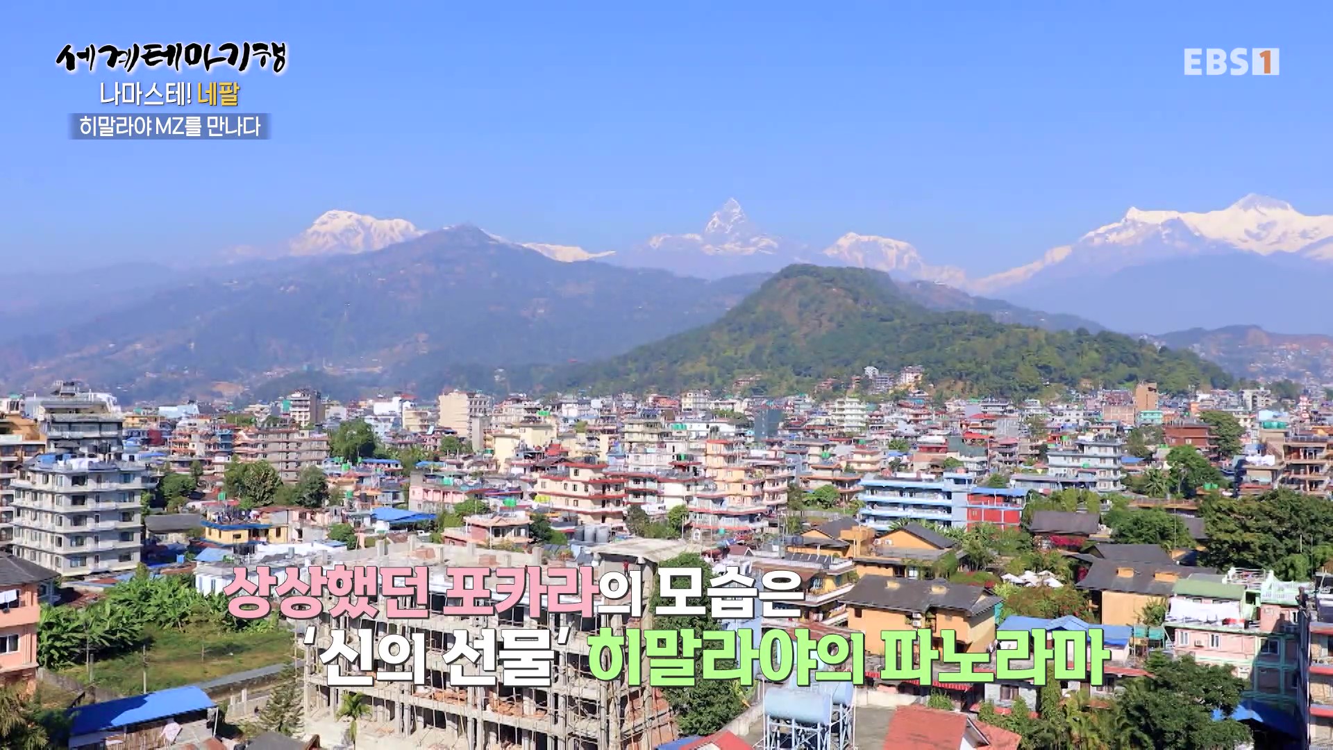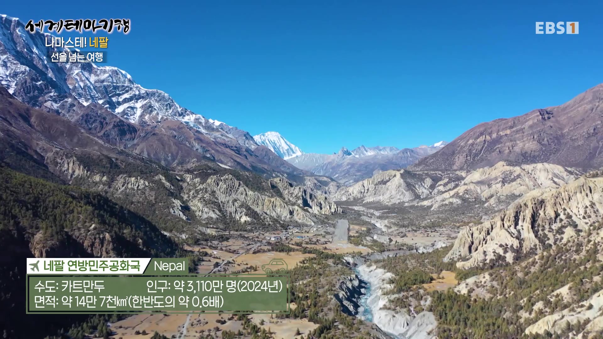 <EBS 세계테마기행>은 안방에 편안하게 앉아서 세계의 명소들을 체험할 수 있는 수준 높은 교양프로그램입니다. 각 방면에 걸쳐 다양한 지식을 가진 전문가가 출연해 실시하는 해설을 따라가노라면 실제로 해외여행을 하는 것 같은 착각에 빠지기도 합니다. 2024년 6월 중순(2024. 6. 17∼6. 20)에는 “세계테마기행, 나마스테 네팔”편이 방영되었습니다. 네팔의 국토면적은 한반도의 0.7배, 인구는 3,124만 명, 수도는 카트만두입니다.