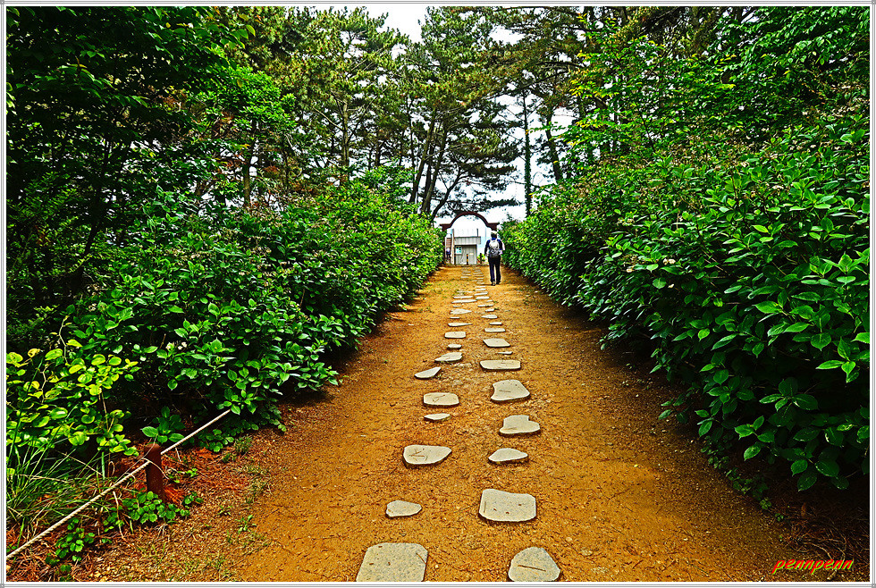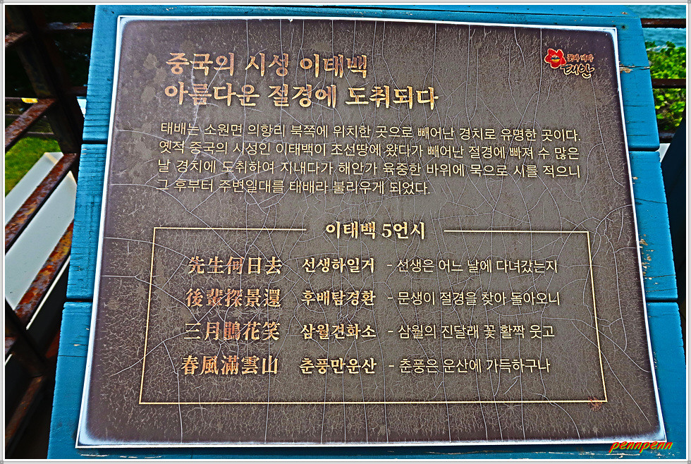 태배전망대는 여기서 약 100여 미터 거리에 있습니다. 태배는 옛적 중국의 시성인 이태백이 조선 땅으로 와서 빼어난 절경에 빠져 수많은 날 경치에 도취하여 지내다가 이곳 해안가 육중한 바위에 묵으로 시를 적으니 그 후부터 주변일대를 태배라 부르게 되었다는 이야기가 전해집니다. 이 전망대는 폐기된 군 막사를 개조해 만든 것입니다.