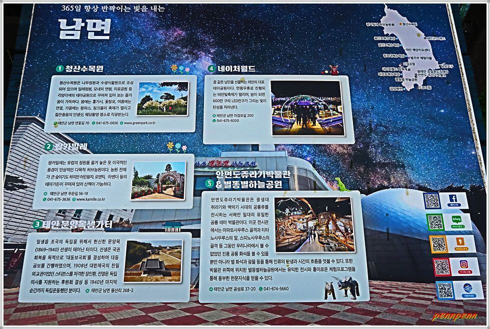 전망대로 오르니 태안의 북쪽 앞바다의 모습에 가슴이 탁 트이는 기분입니다. 여기서는 멀리 신두리 해변 및 해안사구, 작고 아담한 섬들이 옹기종기 모여 있는 해안경관의 모습을 볼 수 있습니다. 그런데 태안군은 이곳을 태안군 소속 8개읍면(태안읍, 안면읍, 고남면, 남면, 근흥면, 소원면, 원북면, 이원면)의 관광명소를 소개하는 홍보전시관으로 꾸며 놓았군요. 태안군을 홍보하려는 멋진 아이디어입니다.