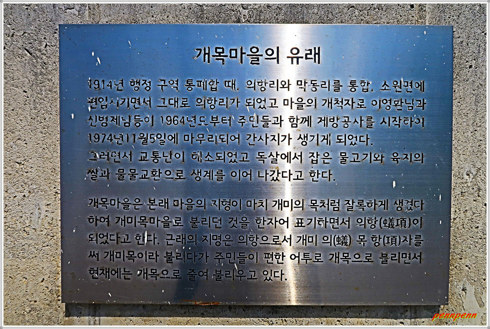 충남 태안군 소원면 의항리 소재 개목마을은 본래 마을의 지형이 개미의 목처럼 잘록하게 생겼다하여 개미목마을로 불리던 것을 한자어로 표기하면서 개미 의(蟻)자와 목 항(項)자를 사용하여 의항이 되었으며 개미목을 주민들이 편한 어투로 개목으로 줄여 부르고 있습니다. 개목마을은 의항항에서 약 500m 지점에 있는 마을입니다.