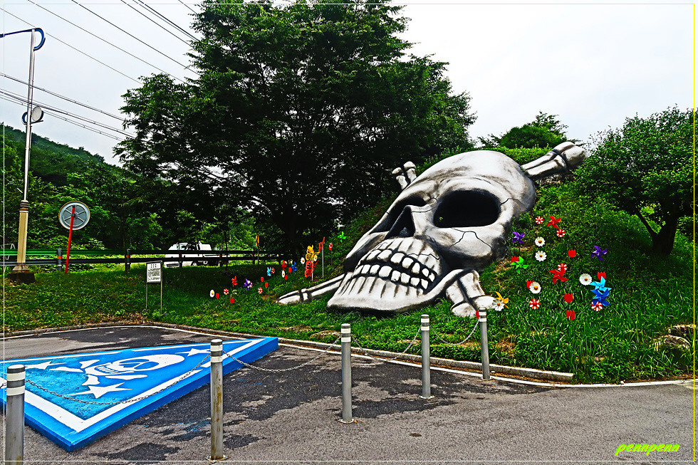 공원 중앙에는 백골상과 부대장병을 익살스럽게(?) 풍자한 조형물이 설치되어 있어 방문객들은 백골상 안으로 들어가 사진을 촬영할 수도 있습니다. 백골상의 코가 하트로 제작한 것도 이를 친근하게 표현한 것으로 보입니다. 사실 해골을 보면 좀 무서운 느낌이 드는데 철원 백골상은 씩씩한 기운을, 여기 조형물은 장난감 같은 모습이어서 웃음이 나오는군요.