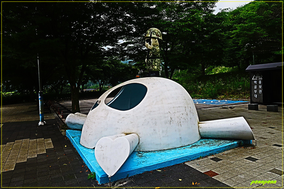 공원 입구에는 대형 백골상(白骨像)이 있군요. 백골부대는 철원군 소재 육군 제3보병사단의 상징명칭으로 경례구호는 백골입니다. 6.25전쟁이전 공산당의 만행에 참고 견디다 못해 월남한 서북청년회 출신 청년들이 자진 입대하여 주축을 이룬 당시 수도사단 소속 제18연대 병사들이 죽어서 백골이 되더라도 공산당과 싸워 조국을 수호하겠다는 의미로 철모에 백골을 그려 넣게 되자 이를 백골부대로 불렀습니다. 그러다가 1950년 12월 제18연대가 흥남 철수작전 때 수도기계화보병사단에서 3사단으로 배속되었고 6.25 전쟁이 끝나고 아예 사단애칭을 사자부대에서 더 전투적인 이미지의 백골부대로 변경한 것으로 전해집니다.(자료/위키백과).