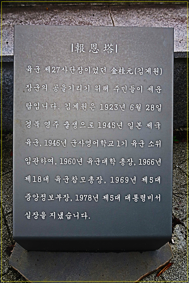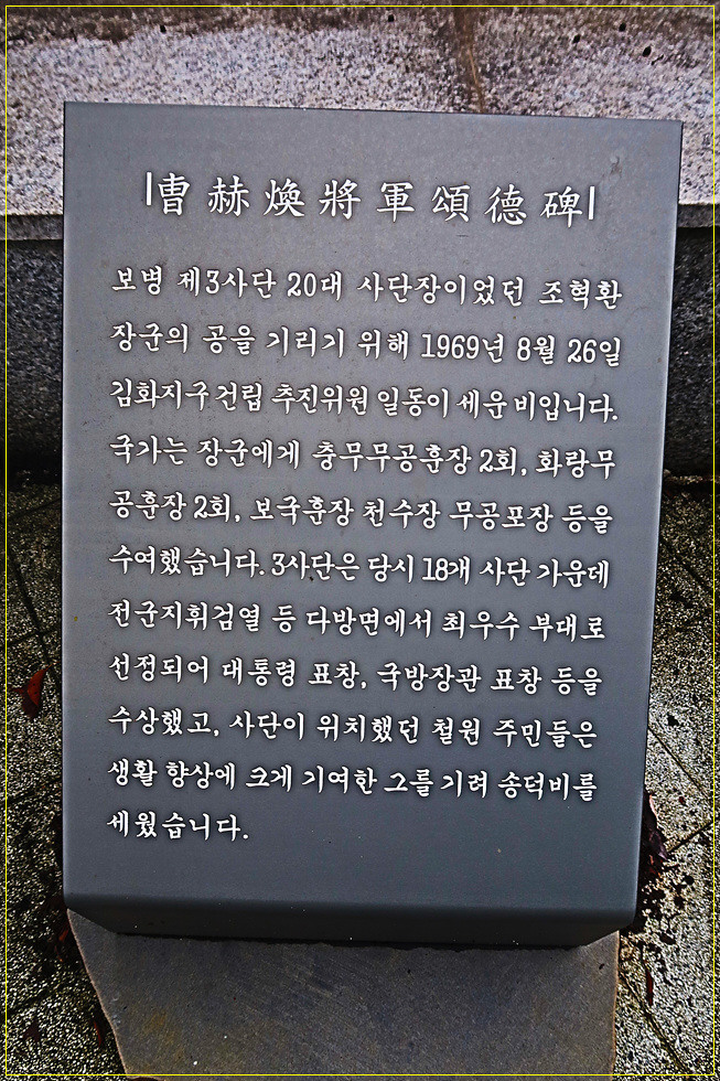 안으로 들어서면 주차장과 공원입니다. 먼저 4기의 비석이 나란히 세워져 있는데요. 이는 경주 김기호 송덕탑비(수복 직후 김화지역 재건, 민통선 출입 및 민원해결 유공), 조혁환 장군 송덕비(조혁환 보병 제3사단장의 혁혁한 전공), 보은탑(육군 27사단장 김계원 장군의 공적 기념), 영세불망탑(육군 제5군단장 최영희 장군 공적 기념)으로 모두 주민들이 세운 송덕비입니다.