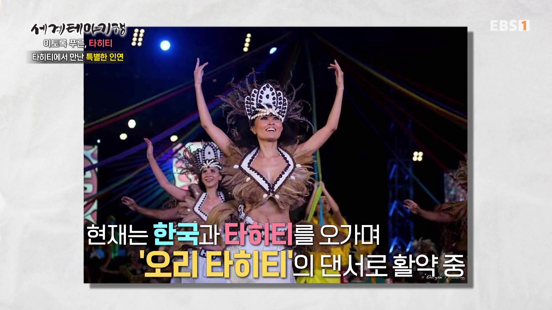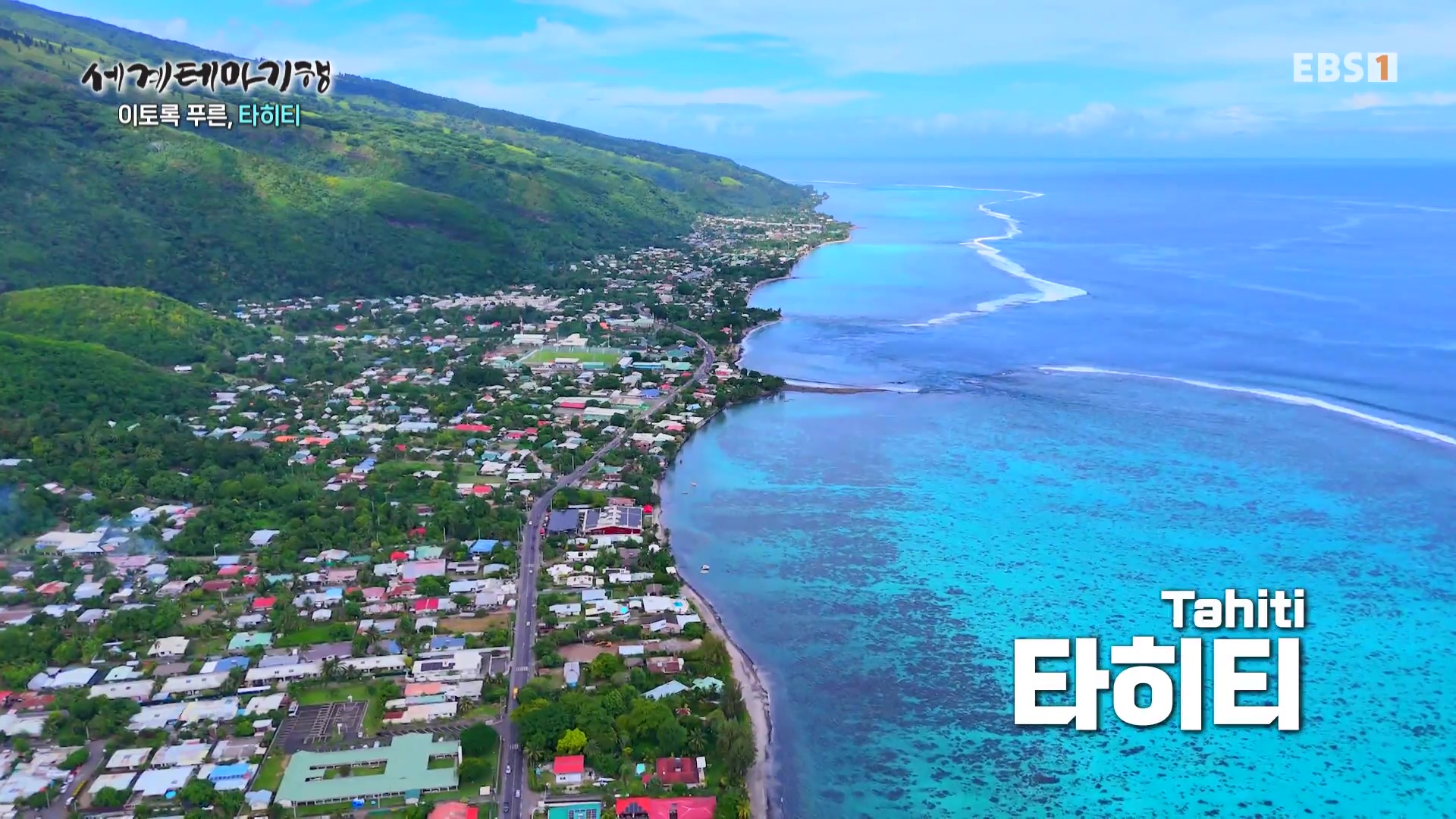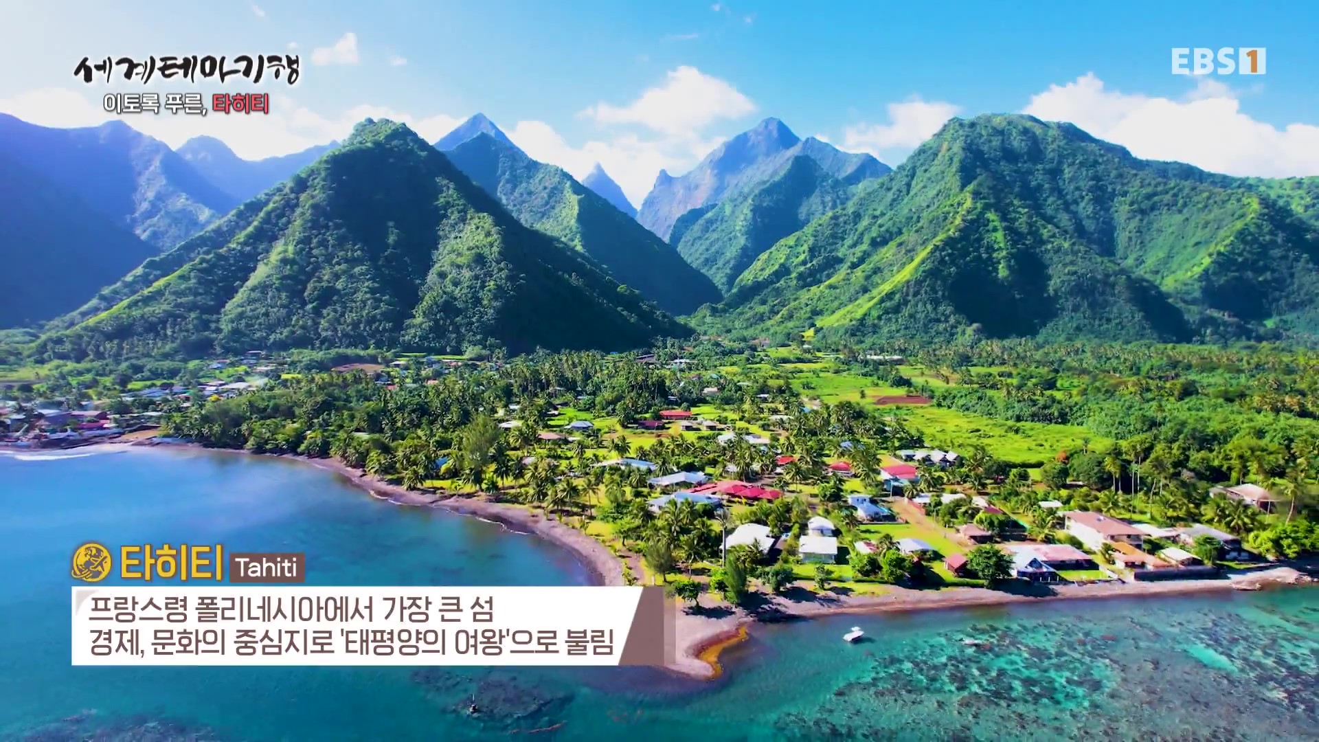 <EBS 세계테마기행>은 안방에 편안하게 앉아서 세계의 명소들을 체험할 수 있는 수준 높은 교양프로그램입니다. 각 방면에 걸쳐 다양한 지식을 가진 전문가가 출연해 실시하는 해설을 따라가노라면 실제로 해외여행을 하는 것 같은 착각에 빠지기도 합니다. 2025년 7월 초순(2025. 7. 7∼7. 10)에는 “세계테마기행, 이토록 푸른 타히티”편이 방영되었습니다. 타히티는 남태평양 남부의 섬으로 프랑스령 폴리네시아에 속하며 폴리네시아의 인구는 약 28만 명, 수도는 파페에테, 언어는 프랑스어와 타히티어입니다. 이번 여행은 김진아 타히티 민속춤 전문가가 안내합니다.