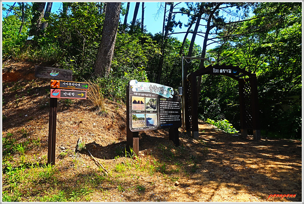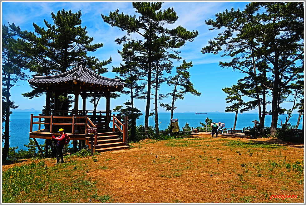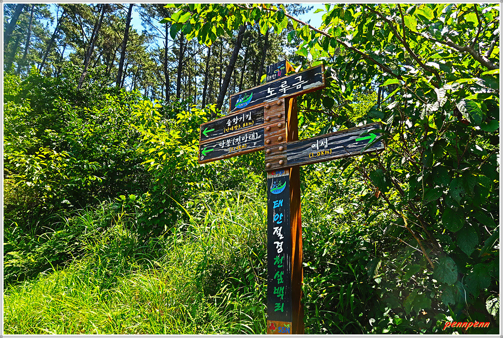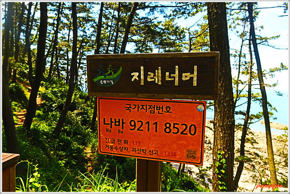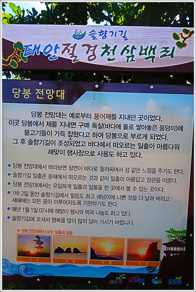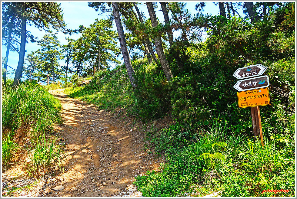 다시 무거운 발걸음을 터벅터벅 옮깁니다. 숲속은 그늘이기는 하지만 바람이 전혀 없어 섭씨 32도의 찜통더위를 피할 수 없습니다. 그리고 지금까지 셀 수 없을 정도로 작은 능선을 오르내리느라 진이 다 빠져 버렸습니다. 노루금과 칼바위를 지나갑니다. 근욱골해변을 뒤로하고 샘너머와 회목쟁이(바다로 들어가고 나오는 길이 좁고 잘록한 모습)를 지나 당봉전망대에 도착합니다. 당봉전망대는 옛날엔 넓은 바위가 있어 그곳에 제사상을 차려놓고 풍어제를 지냈던 자리인데 지금은 매년 1월 1일 해맞이 행사를 하고 있습니다.