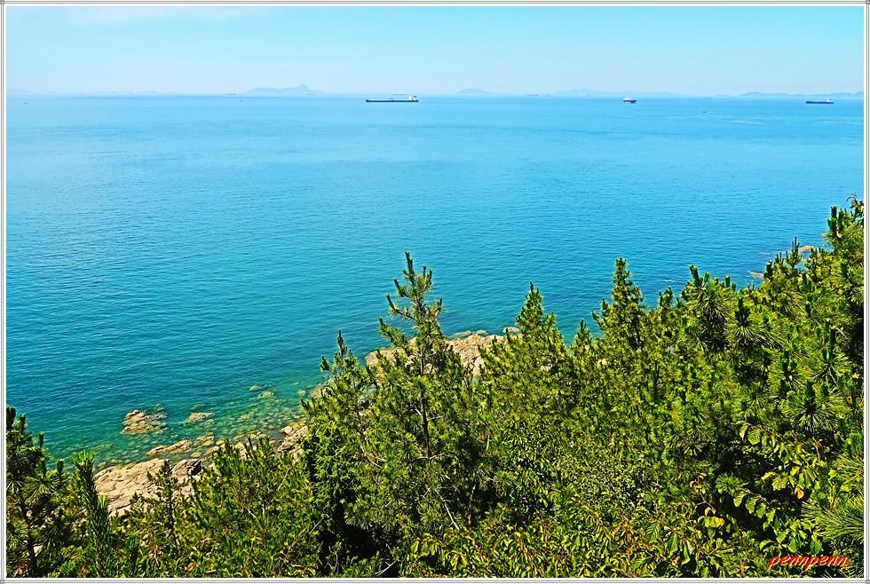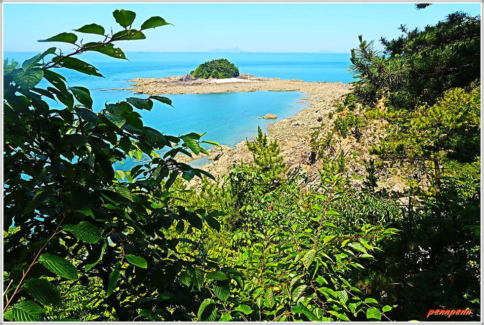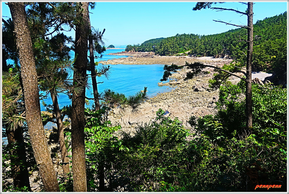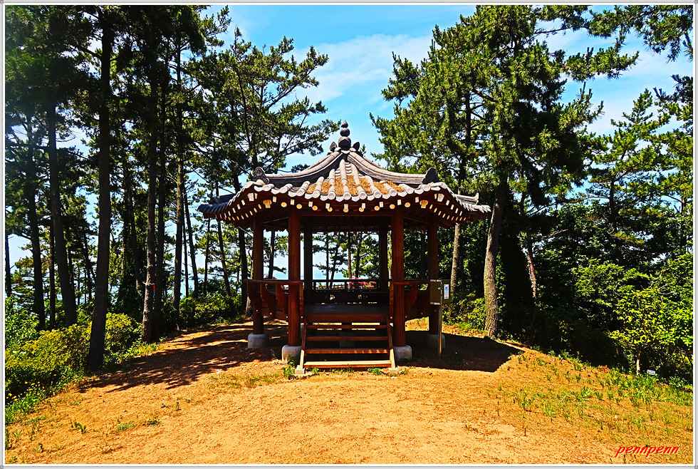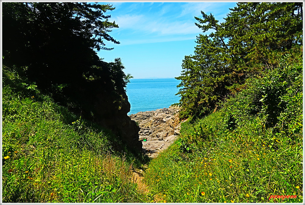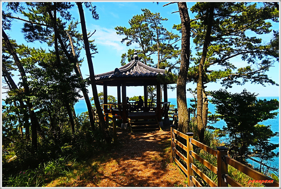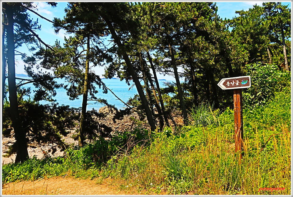 다시 무거운 발걸음을 터벅터벅 옮깁니다. 숲속은 그늘이기는 하지만 바람이 전혀 없어 섭씨 32도의 찜통더위를 피할 수 없습니다. 그리고 지금까지 셀 수 없을 정도로 작은 능선을 오르내리느라 진이 다 빠져 버렸습니다. 노루금과 칼바위를 지나갑니다. 근욱골해변을 뒤로하고 샘너머와 회목쟁이(바다로 들어가고 나오는 길이 좁고 잘록한 모습)를 지나 당봉전망대에 도착합니다. 당봉전망대는 옛날엔 넓은 바위가 있어 그곳에 제사상을 차려놓고 풍어제를 지냈던 자리인데 지금은 매년 1월 1일 해맞이 행사를 하고 있습니다.