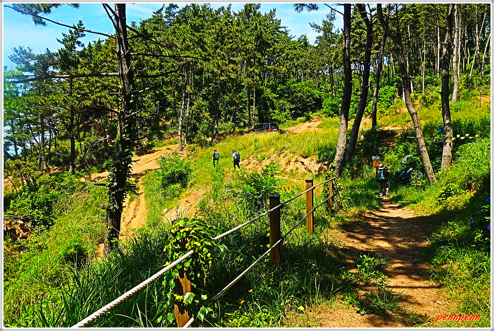 오늘 약 10km를 걷는데 4시간 20분이 소요되었습니다. 원래 거리는 8.4km이지만 코스에서 벗어난 용난굴을 답사하느라 더 걸은 탓입니다. 그냥 코스 개요를 보면 거리도 짧고 해발고도도 낮아 평범하고 쉬워 보이지만 실제로는 가랑비에 옷이 젖듯 자주 오르내리노라면 어느새 지쳐있는 자신을 발견하게 됩니다. 이곳에 참여한 산악회 회원들은 등산과 걷기에는 산전수전공중전까지 겪은 베테랑들인데 상당수가 이구동성으로 서해랑길 중 가장 힘든 코스의 하나라는데 동의했습니다. 특히 삼복더위 철이어서 더욱 그러했지요.
