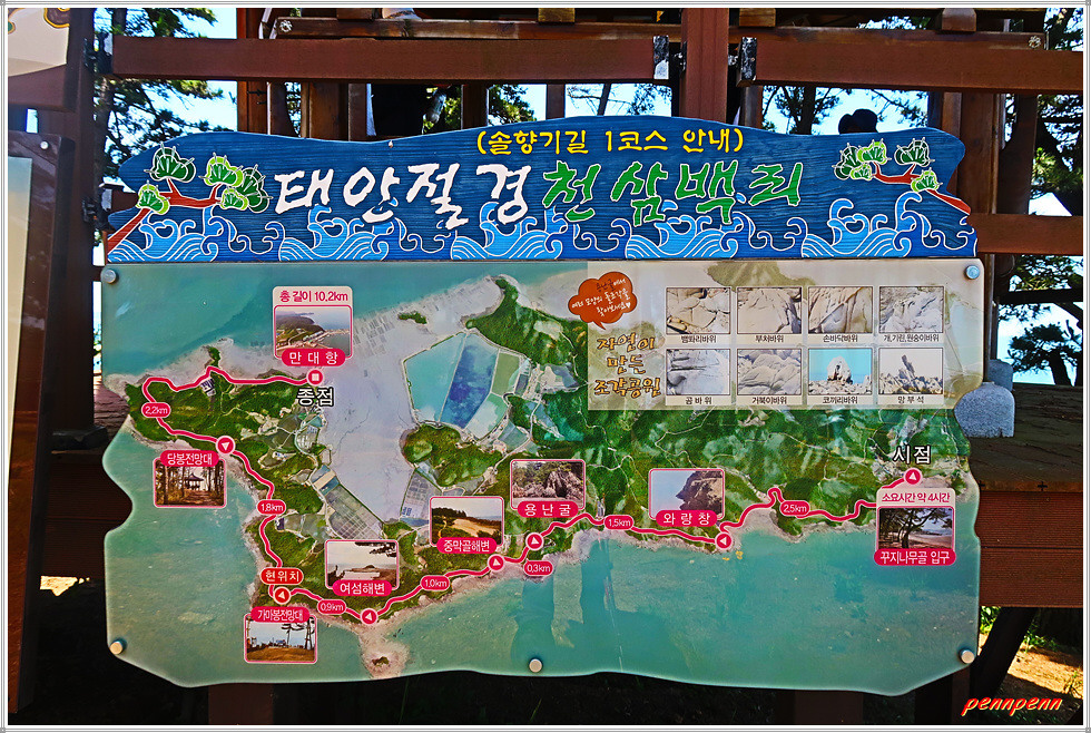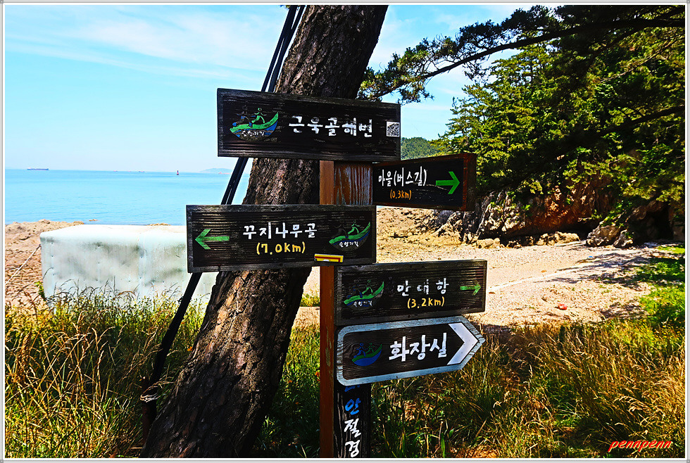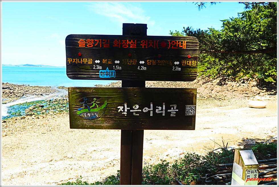 꾸지나무골 해수욕장 북단 경기대수련원 앞에는 서해랑길 72코스를 알리는 안내지도가 있는데 그 옆에는 태안솔향기길 안내도도 보입니다. 태안해안길은 솔향기길, 해변길, 태배길, 안면솔길로 나뉘어지는데, 태안솔향기길 1코스는 오늘 걸어야할 서해랑길 72코스와 동일한 노선입니다. 초입부터 작은 고개를 넘으며 “아! 이게 아닌데!”라고 생각했다면 지극히 정상입니다.