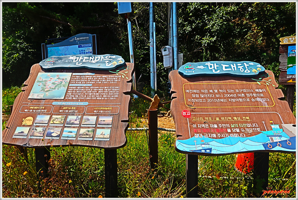 다시 우측의 숲길로 들어섰다가 해상나무데크로 내려왔는데 데크가 끝나는 지점인 만대항에 서해랑길 73코스 지도가 있습니다. 태안군 이원면 내리 소재 만대항은 태안 최북단의 항구로 2004년 어촌정주어항으로 지정됐으며, 2010년에 지방어항으로 지정된 곳입니다. 만대항에서는 비교적 조용하고 한적한 바다여행을 할 수 있으며, 많은 낚시객들이 방문해 선착장에서 미끼를 던지면 망둑어를 비롯해 우럭, 노래미 등이 올라옵니다.