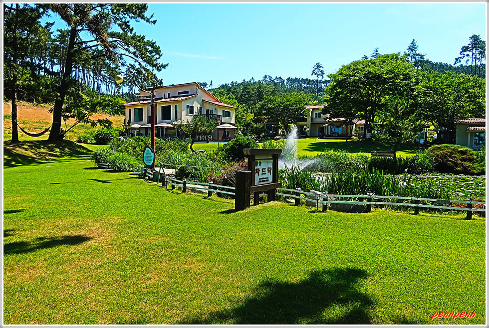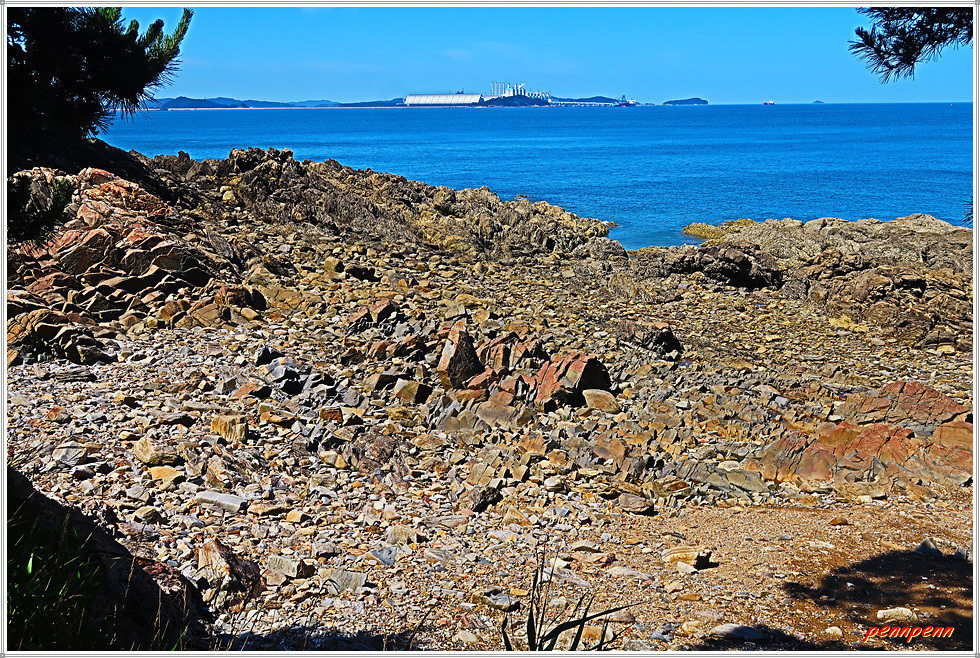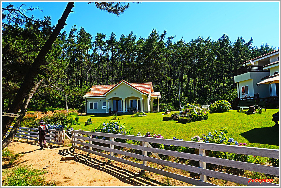 첫 번째 고개를 넘어 안부에 도착하니 도투매기입니다. 지명에 대한 해설이 없어 이개 무슨 뜻인지 모르겠지만 수국이 피어 있는 아담한 펜션이 반겨줍니다. 바다 건너 태안화력발전본부가 잘 보이네요. 다시 고개를 넘어가 큰어리골에 도착합니다. 자드락 펜션 앞에는 모래와 암석이 있는 해변이 나타나네요.