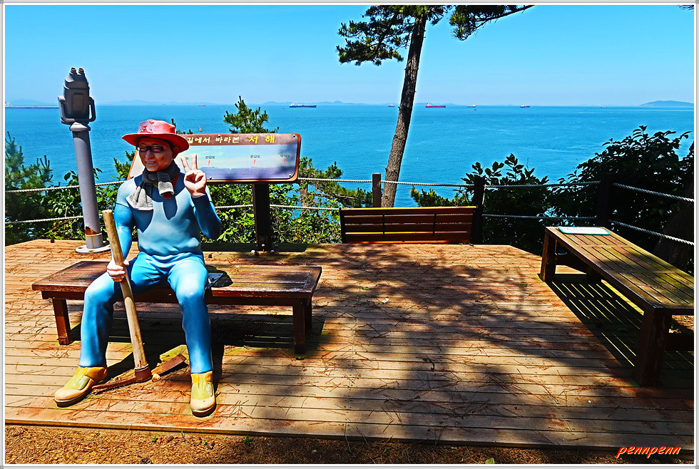 이곳 전망대에는 V자를 그리고 앉아있는 남성상이 있는데 바로 솔향기길 지킴이 차윤천 선생의 조형물입니다. 천혜의 자연 경관 절경을 자랑하는 태안 앞바다에 2007년 12월 7일 이 지역을 운항하던 선박(허베이스피리트호)에서 원유유출사고가 발생해 큰 재앙이 일어났습니다. 당시 이원면민회장을 맡고 있던 차윤천 선생은 기름 제거작업을 위해 위험한 비탈길과 언덕에 길을 내어 간신히 바닷가로 접근할 수 있도록 노력하였습니다. 그 후 3년에 걸쳐 곡괭이로 산을 깎고 다듬어 꾸지나무골과 만대를 연결하여 지금의 솔향기길 1코스(10.2km)가 탄생하게 되었으며, 태안군에서 안전시설과 정자를 세우고 화장실 등 편의시설을 설치하여 솔향기길 방문객들이 편안하고 안전하게 이용하고 있습니다.