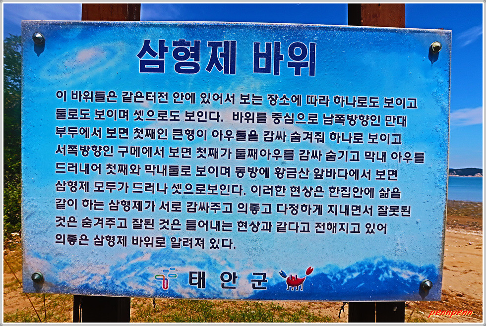 쇠막금해변과 붉은앙뗑이를 뒤로하고 이원반도의 동쪽바다로 진입합니다. 큰구매수둥 위로 올라 좌측으로 가면 삼형제봉, 우측으로 가면 만대항인데, 너무 피곤해 삼형제봉은 생략하고 만대항 방면으로 내려섭니다. 해변가에 도착하니 삼형제바위 안내문이 있군요. 태안군 이원면 내리 소재 삼형제바위는 홀어머니를 모시고 사는 삼 형제가 어느 날 어머니가 뻘일을 나가 돌아오지 않자 나란히 앉아 어머니를 부르다 앉은 채 죽어 바위가 됐다는 전설이 전해지며, 보는 장소에 따라 하나에서 세 개까지 달리 보입니다.