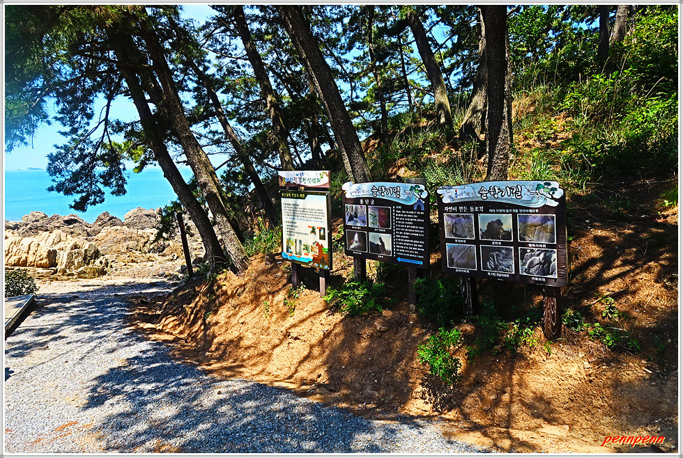 다시 숲길로 진입했는데 정자가 있는 곳에 와랑창이라는 안내문이 있습니다. 와랑창은 세모꼴 모양의 수직으로 뚫린 해저 동굴 속 바위 사이로 바다와 이어진 작은 창이 있어 작은 물결에도 파도가 일어 울려 퍼지는 물소리가 와랑와랑 소리가 요란하게 난다고 하여 와랑창이라 불리게 되었다고 합니다. 좌측 정자아래에는 조망대가 있어 이곳을 내려가면 독수리 바위를 볼 수 있습니다.