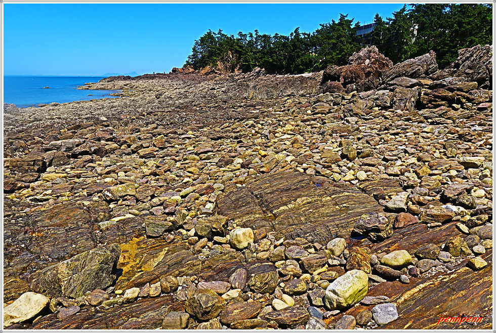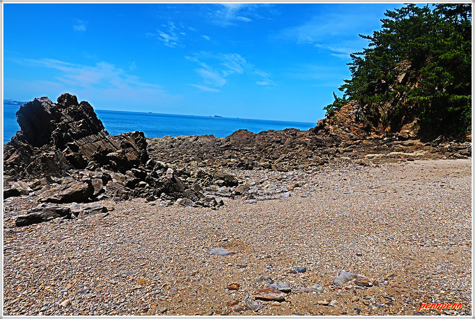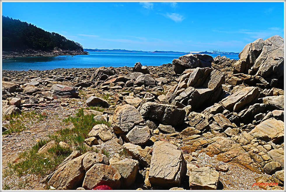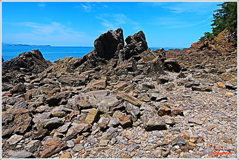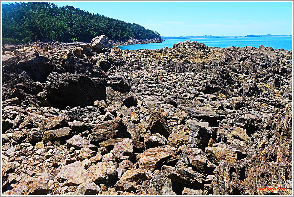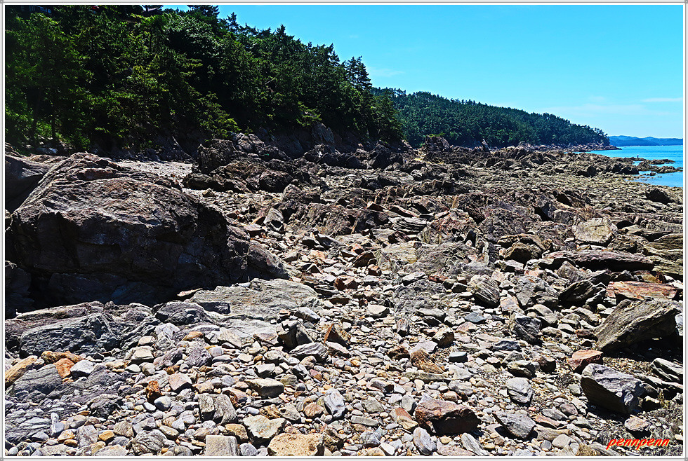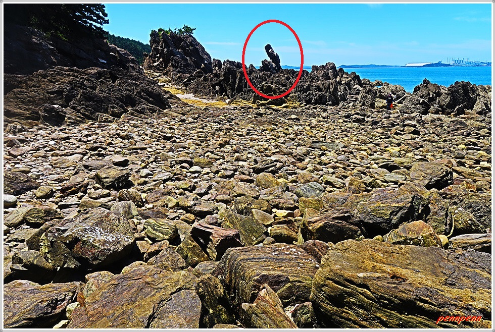 용난굴을 나와 북쪽으로 갑니다. 이쪽에도 바위가 지천으로 깔려 있군요. 잠시 후 해변 우측에 만대항으로 가는 이정표가 보입니다. 따라서 용난굴 남쪽에서 진입했다면 원래 진입로로 되돌아가지 않아도 이곳에서 나갈 수가 있는 것입니다. 출구 쪽으로 가면서 뒤돌아보니 방금 지나온 용난굴이 좌측에 보입니다.