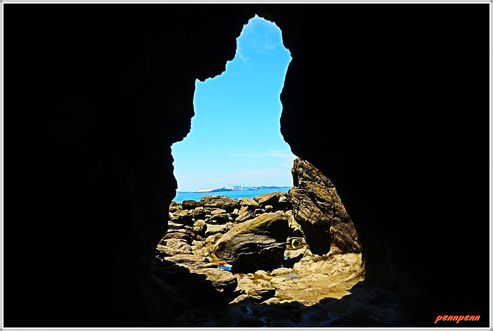 다만 답사시간이 충분치 못해 굴의 내부를 자세히 관찰 여유가 없군요. 그래도 내부에서 바깥으로 바라본 굴의 모습은 그럴듯합니다. 멀리 바다 건너 태안화력발전본부의 모습도 살포시 보입니다. 용난굴을 나오니 바로 눈앞에 용으로 승천하지 못해 망부석으로 변한 바위가 우뚝합니다.