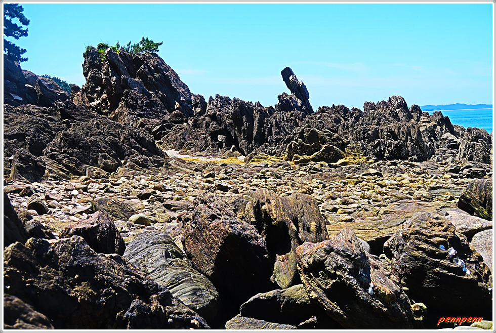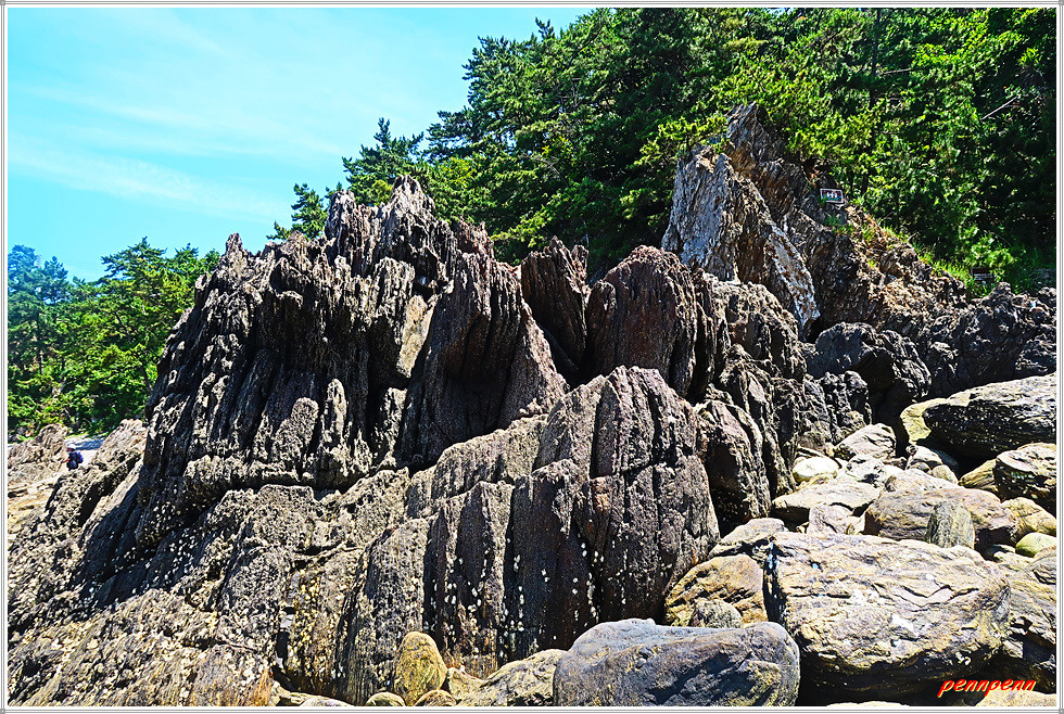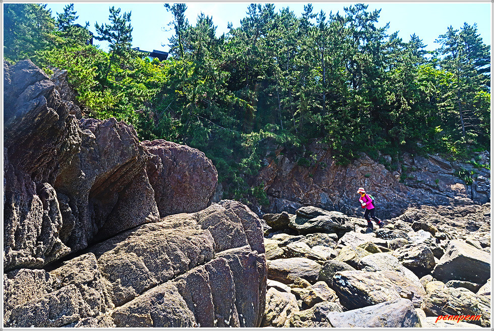 바위가 깔린 해변으로 들어섭니다. 삼각형 형태의 큰 바위 옆을 지나가자 저 앞에 용난굴이 보입니다. 여기서 북쪽으로도 해안가에는 모래대신 바위가 널브러져 있는 모습이네요. 용난굴 위에는 이를 알리는 글자가 부착되어 있어 이곳을 찾은 이들이게 도움을 줍니다.