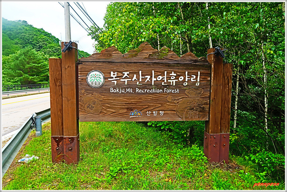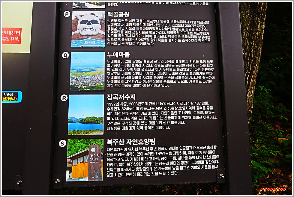 조금 더 가니 좌측에 복주산 자연휴양림 입구가 보입니다. 철원군 근남면 잠곡리 소재 복주산 자연휴양림은 1998년에 조성된 국립자연휴양림으로 인공림과 어우러진 울창한 산림과 맑은 계곡이 있어 수려한 자연경관을 자랑하며, 각종 야생 동식물이 서식하고 있습니다. 산책로를 따라 산림욕도 즐길 수 있으며, 휴양림에는 숙박시설인 산림휴양관이 있고, 산림문화프로그램도 운영하고 있습니다.