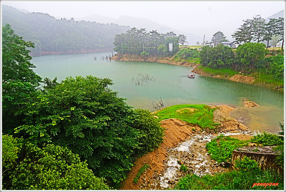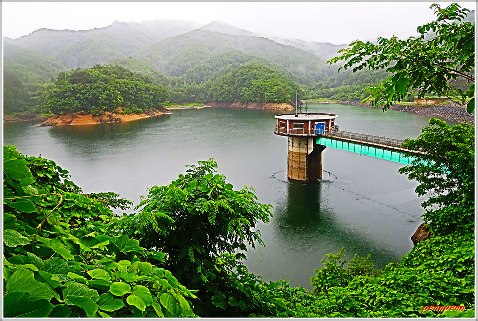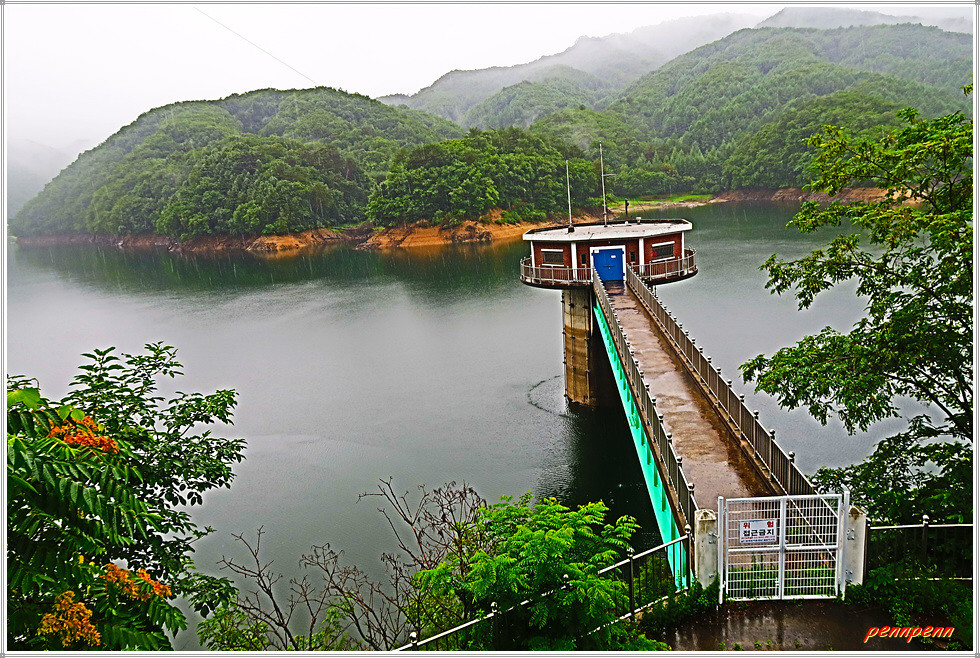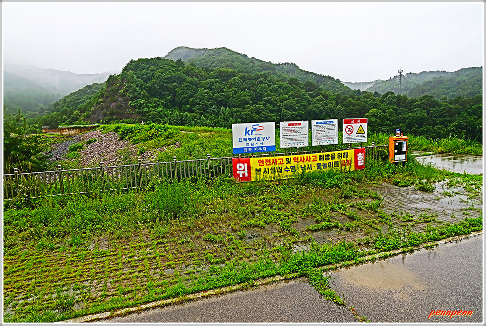 잠곡저수지 수문을 지나면 상당히 규모가 큰 잠곡저수지의 모습이 보입니다. 그런데 갑자기 많은 비가 내립니다. 요즘은 일기예보를 종잡을 수 없을 지경입니다. 오늘은 오후 1시까지 1-5mm의 비가 내린다고 예보되었지만 현재 우산을 썼는데도 세차게 내리는 비로 인해 바지가 빗물에 젖을 정도이며 금방 사방이 뿌옇게 변해 요즘 추세인 국지성 호우를 실감합니다.