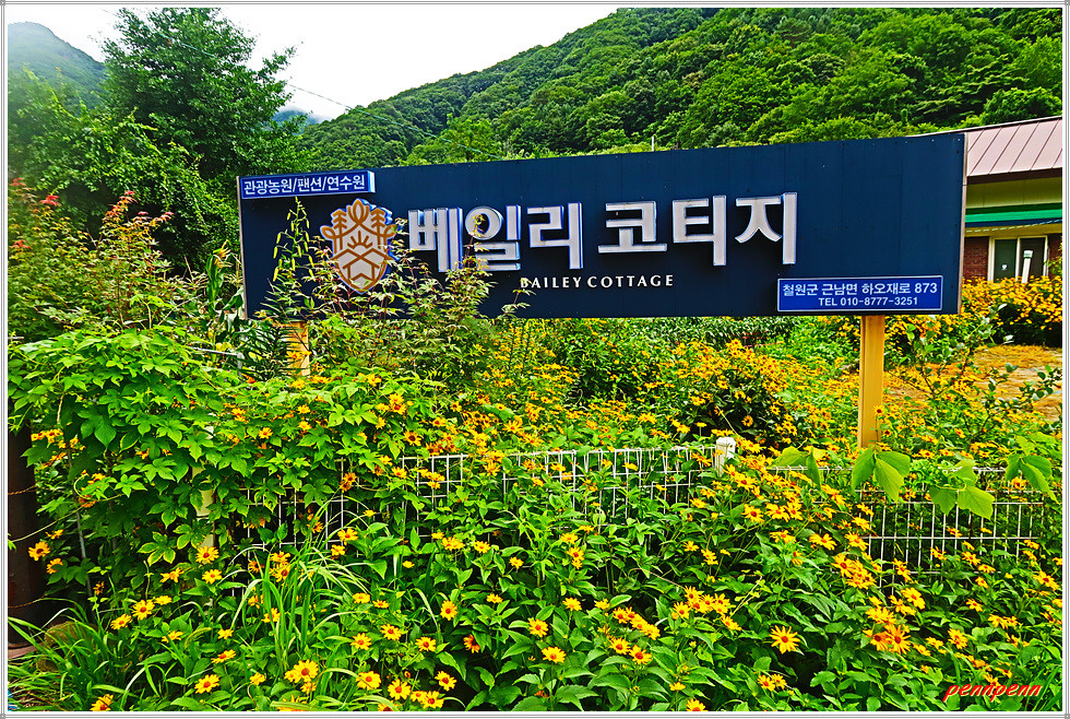 데크를 벗어나 민가를 통과해 463번 지방도로로 다시 나갑니다. 길섶에는 꼬리조팝나무가 화사하게 피어 있군요. 그간 강하게 내리던 비가 어느 새 잦아들어 이젠 발걸음이 가볍습니다. 베일리 코티지 관광농원에는 루드베키아(원추천인국)와 유사한 애기하늘바라기꽃(멜란포디움)이 지천으로 피어 있습니다. 비를 머금은 배추밭도 싱싱하군요.