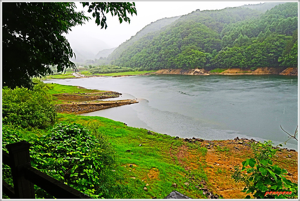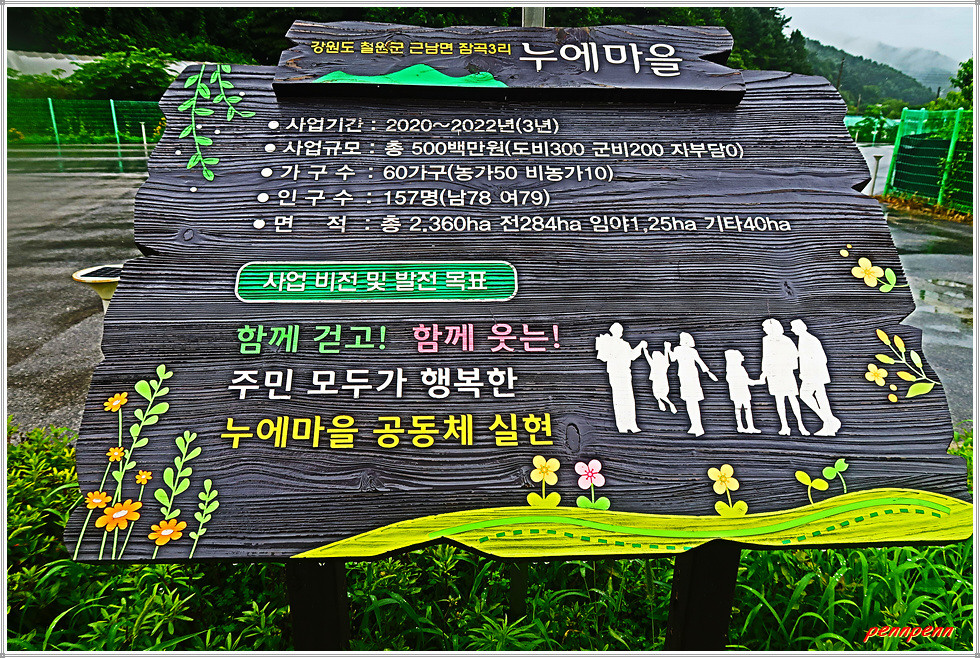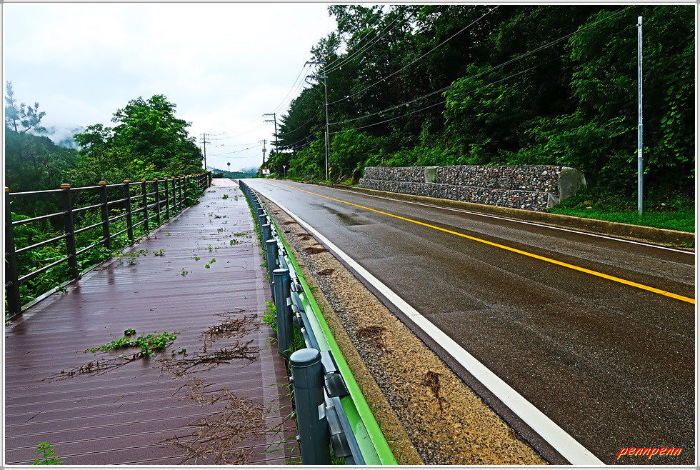 노블리스 캠핑장을 뒤로하고 도로 우측 방화동 방면으로 진입합니다. 길섶에는 DMZ평화누리자전거길 안내문이 보입니다. 사실 필자는 2년 전 평화누리길을 걸으며 이곳을 이미 답사했습니다. 나무데크길로 들어서 바라보는 누에호수의 풍경은 안개에 젖은 모습입니다. 전망데크에 도착했지만 비로 인해 호수의 풍경을 즐길 마음의 여유조차 없습니다. 호수의 상류로 갈수록 초지가 보이는군요.