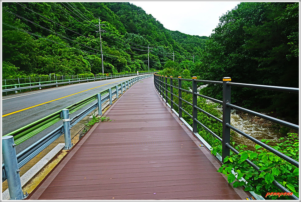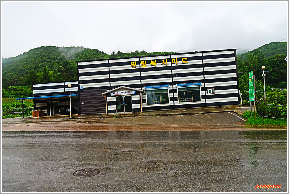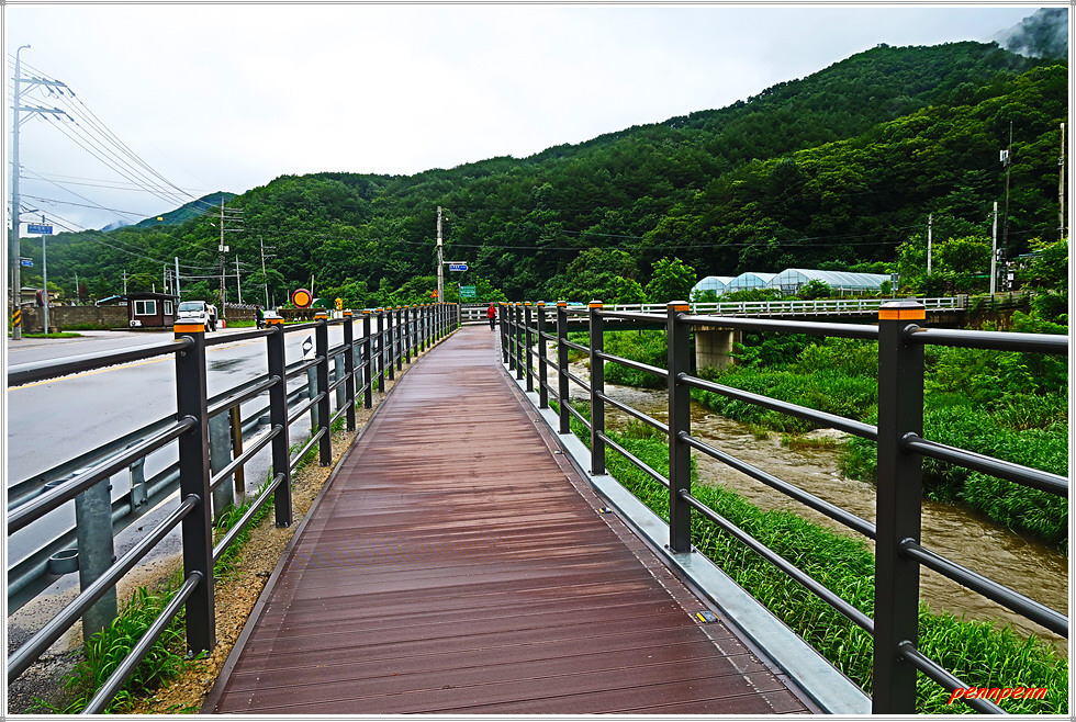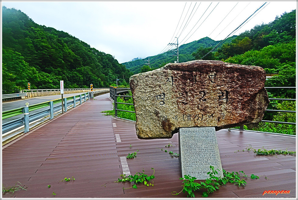 도로변 데크길을 따라 조금 더 가는데 민가의 벽면을 장식한 대형태극기가 애국심을 자극합니다. 승리부대 마크가 있는 건축물을 지나면 도로 우측에 평화의 길 이정목이 있는데 이곳은 평화의 길 20코스 갈림길로 이번 코스 종점(명월2리버스정류장)은 여기서 국도를 따라 약 300m 정도 더 가야합니다. 상실내교를 건너가면 우측에 명월복지마트가 보이고 그 맞은편 이정목에 QR인증코드가 있습니다. 이곳은 복주산 북쪽능선을 넘어오는 19코스의 종점이기도 합니다.