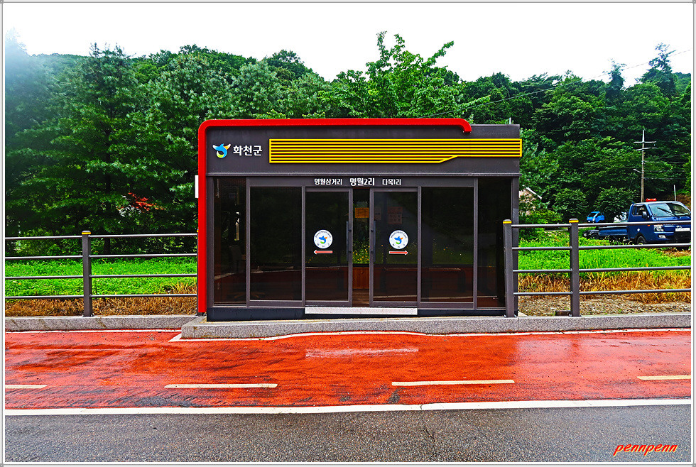 15사단을 뒤로하고 계속해서 걷는데 나리꽃 중 가장 아름답다는 참나리도 보이고 사과도 영글 날을 기다립니다. 사창천 바닥에는 암석이 많군요. 명월2리 마을표석과 하실내교, 대명사입구, 명성유치원, 명월2리 무더위쉼터를 차례로 지나갑니다. 워낙 오지여서 그런지 버스정류장에도 명칭이 없군요. 명월2리마을회관 옆 정류장은 이름이 있습니다.