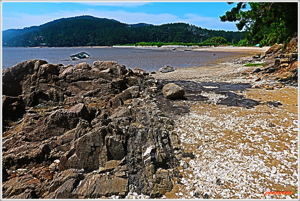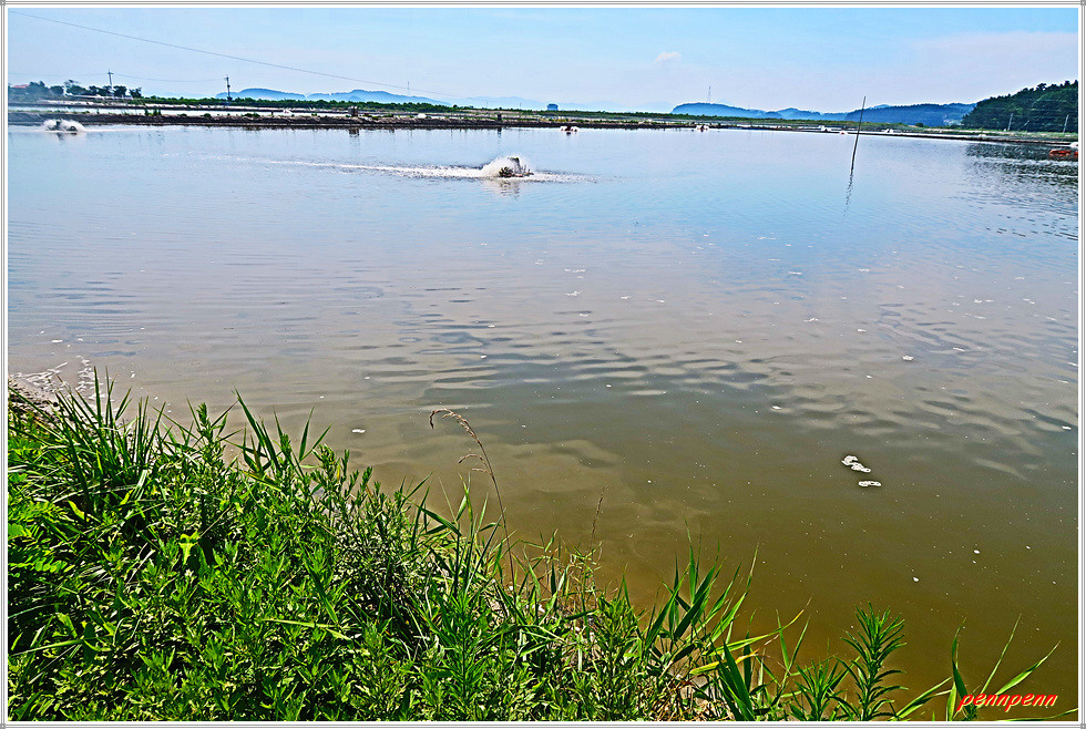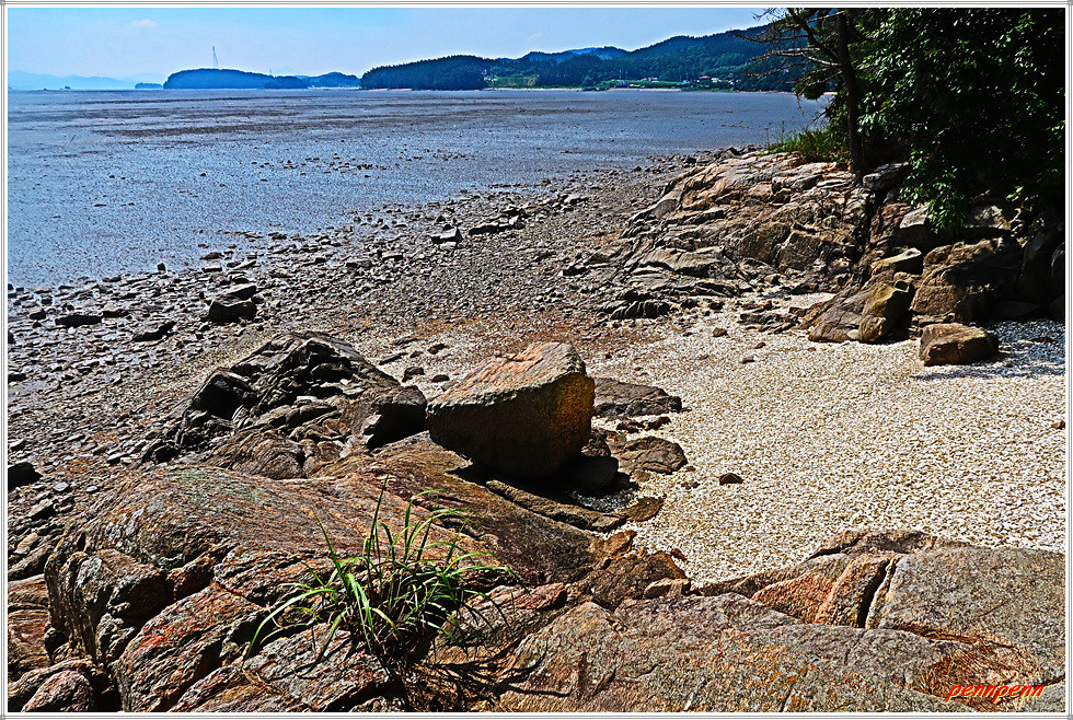 그런데 지금은 워낙 더워서인지 체험마을은 쥐죽은 듯 고요하군요. 여기서 방조제를 이용해 남서쪽으로 걷습니다. 광활한 갯벌이 있기에 어촌체험이 가능한 것 같습니다. 방조제 안쪽은 아까 만났던 양식장이지요. 방조제가 끝나면 길은 해안가로 이어지는데 마침 간조시간대라서 해안길 걷기가 가능합니다. 만조시간대에는 약 1.6km에 달하는 해안길 대신 우회로를 걸어야한다는 안내문이 붙어 있군요.