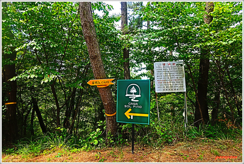 임도 양쪽으로는 울창한 숲이 펼쳐지지만 35도에 육박하는 무더위에 거의 바람이 없으니 몸도 마음도 점점 더위에 지쳐갑니다. 좌측 어딘가에 후망산(104m)이 있을 것이지만 위치를 가늠하기 어렵습니다. 솦피노 카페 겸 펜션 갈림길을 지나 축 늘어진 육신을 이끌고 터벅터벅 발걸음을 옮기노라니 꾸지나무골 유스호스텔인데 이는 지난 서해랑길 72코스를 답사하면서 만났던 건축물이라서 무척 반갑네요. 공식 이정표를 보니 아직도 목적지까지 5km를 더 걸어야 합니다.