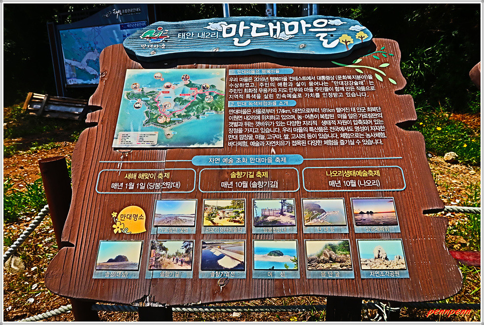 ▲ 코스 : 만대항-백화염전저수지-만대솔향기염전-내2리(목로골)버스정류장-임도-꾸지나무골 유스호스텔-꾸지나무골해수욕장 입구-만대어촌체험마을-방조제-해안가길-굴다리-사목여항비-관리1리(누리재)버스정류장