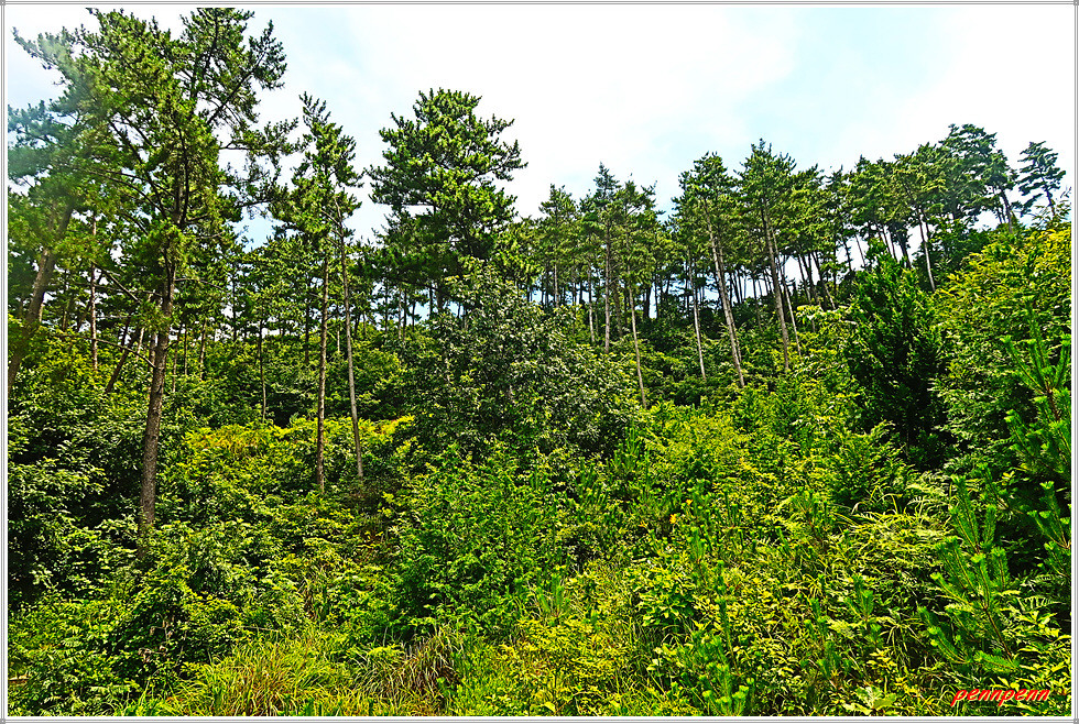 내2리(목로골)버스정류장에서 국도를 이탈해 우측으로 진입합니다. 마을도로를 따라 가면서 청춘여관을 뒤로하면 용난굴 삼거리인데 여기서 용남굴은 우측으로 내려가야하지만 우리는 좌측의 임도로 들어섭니다. 여기서부터 상당한 거리를 임도를 걸어야하는 지루한 여정이 이어집니다. 임도고개에서 잠시 숨을 고른 후 꾸지나무골 해수욕장 방면으로 몸을 돌려세웁니다. 고사목이 많이 보이는 숲에서 포장된 임도를 버리고 좌측의 비포장 임도로 진입합니다.
