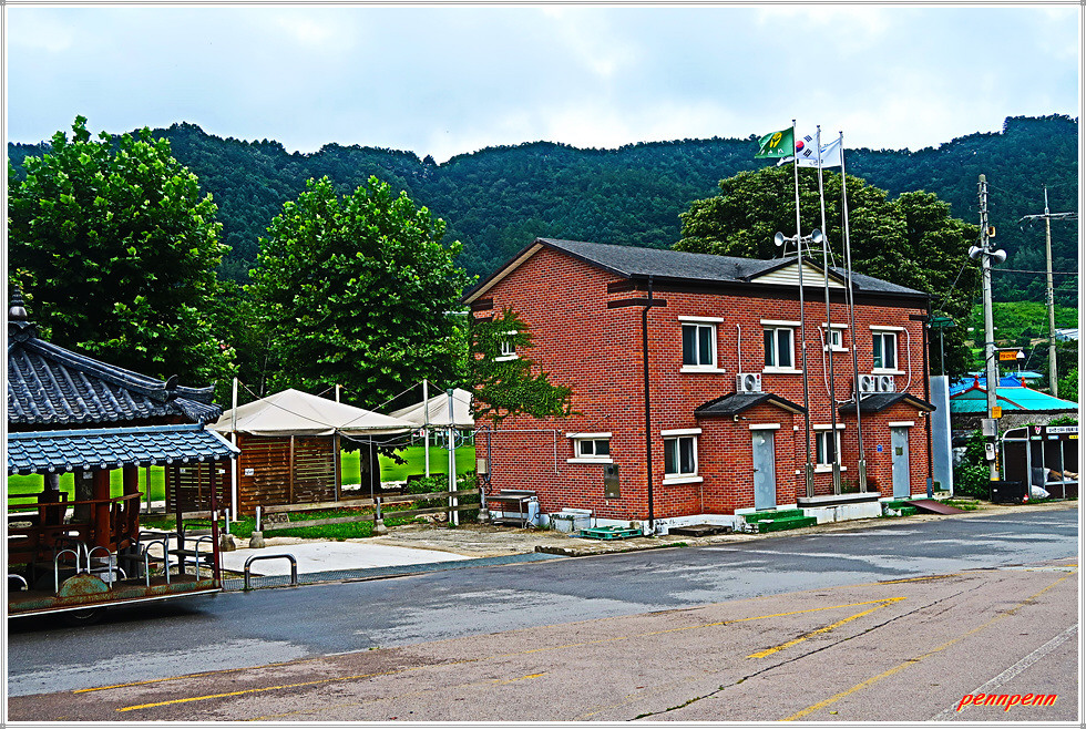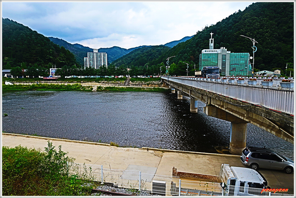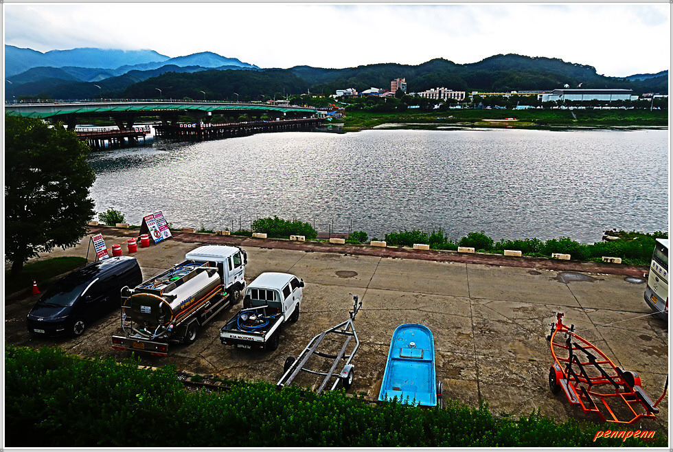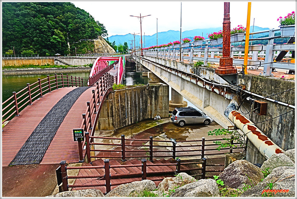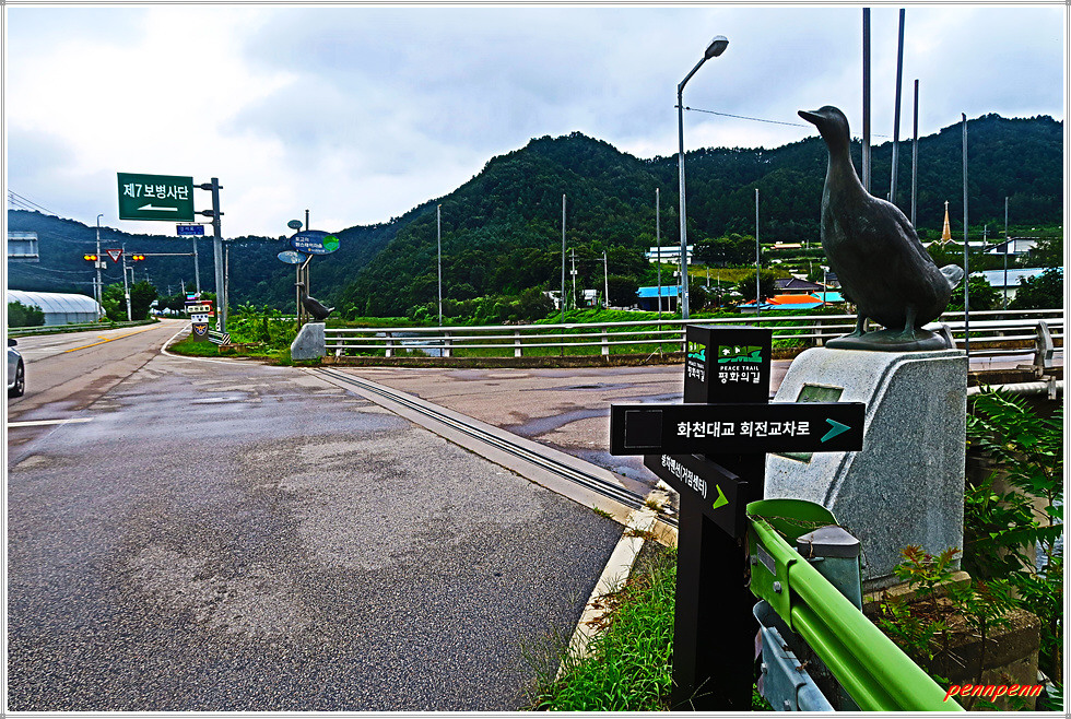 회전교차로 옆에는 평화의 길 종합안내도와 색소폰을 부는 남자, 그리고 야간조명용 시설물이 설치되어 있는데 유감스럽게도 현재 북한강을 가로지르는 노후화된 화천대교를 대체하기 위한 신화천대교 개설공사 중으로 공사용자재가 어지럽게 놓여있어 사진을 찍기가 매우 어렵습니다. 오늘 14km를 걷는데 3시간 30분이 소요되었습니다. 원래 거리는 12.7km이지만 산타클로스 우체국을 답사하느라 조금 더 걸은 탓입니다. 걷기를 시작할 즈음에는 비가 오락가락했지만 다행히도 비가 그쳐 잘 마무리할 수 있었으며 산타클로스 우체국을 경유한 것은 참 잘한 선택이었습니다.