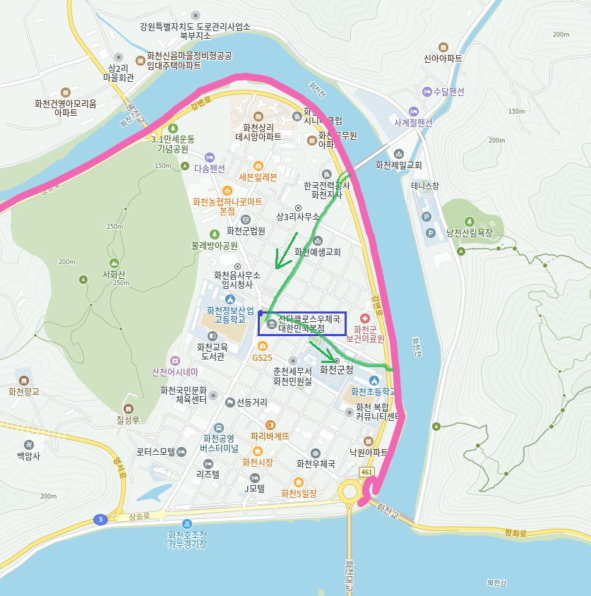 ▲ 코스 : 청청아리풍차펜션-산천어밸리-토고미마을-파포천-화천천-배머리교-산타클로스우체국-화천대교 회전교차로