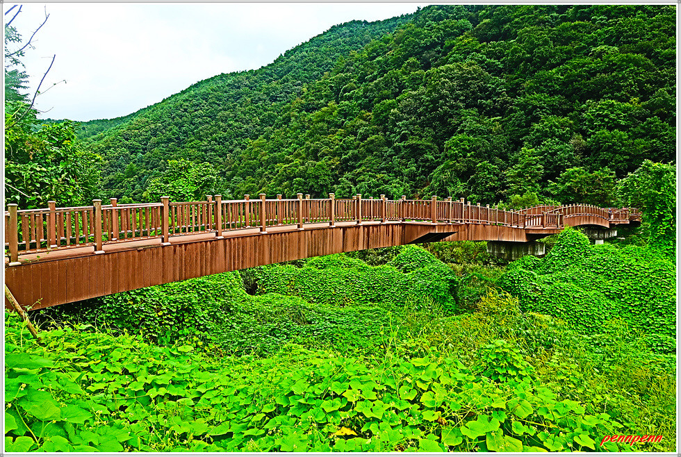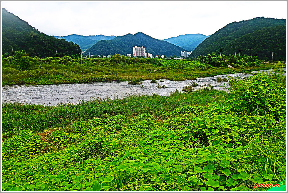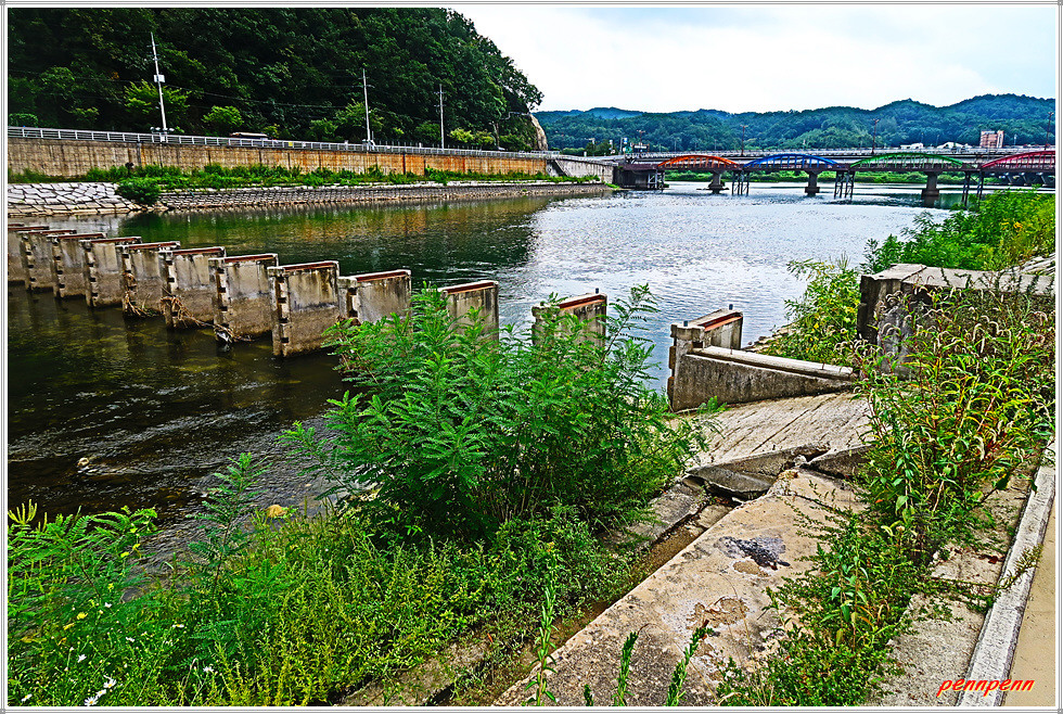 목재다리를 건너 남하합니다. 긴 군사시설 울타리지역을 통과하면 쉼터인 정자가 나옵니다. 파포천변은 온통 박가시가 점령한 모습이네요. 동쪽으로 멀리 고층아파트군이 보이기 시작하는데 이곳은 파포천이 화천천과 합류하는 지역입니다. 이곳은 상수원보호구역임을 알리는 안내지도가 보입니다. 길은 차도(상승로)아래 파포천변으로 이어지는데 비가 내린 때문인지 간간히 물에 잠겨 있어 매우 미끄럽고 또 신발이 젖을 정도입니다.