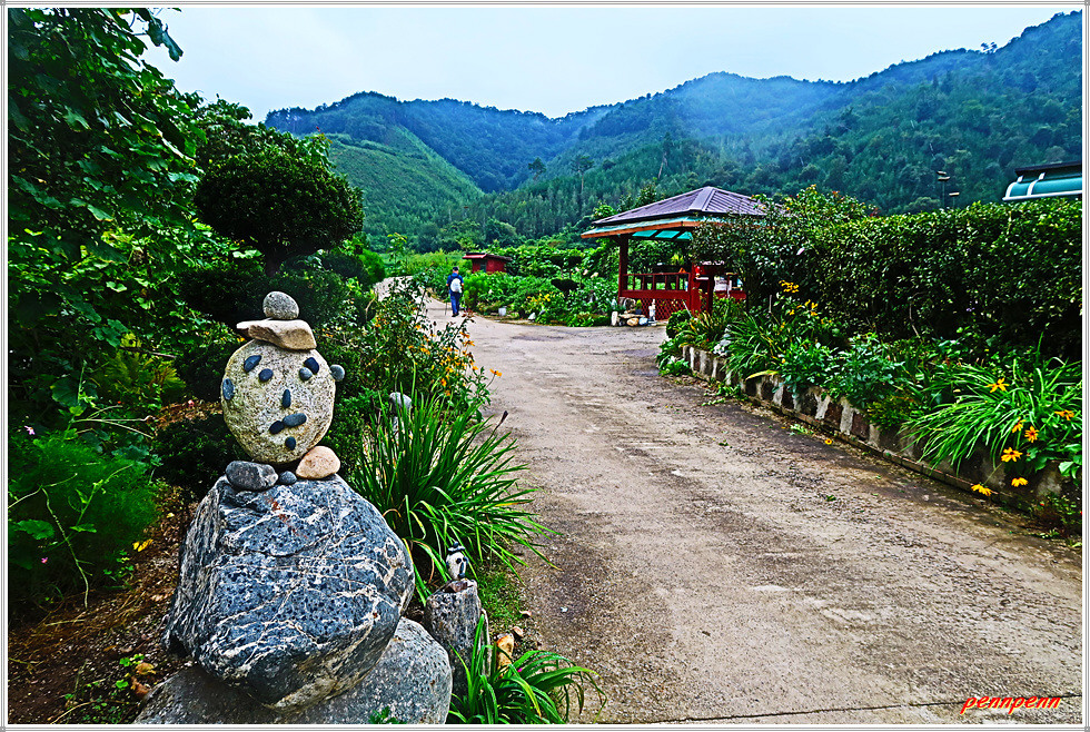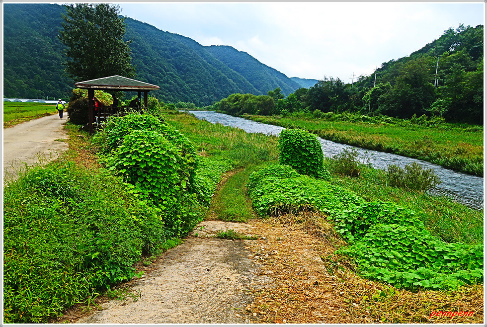 산천어밸리를 뒤로하고 도로를 걸어갑니다. 잠시 내리던 가을비가 잦아들어 우산을 접습니다. 만산동계곡의 도로변에는 가끔씩 펜션이 보이다가 사라지기를 반복하네요. 군부대 앞에서 구운천에 걸린 구운교를 건너 좌측으로 진입합니다. 조생종 벼도 고개를 숙이고 있고 대추와 사과 등 가을철 과일도 영글어갑니다. 이번에 만난 다리도 구운교로군요. 돌로 만든 눈사람도 훌륭한 예술작품이 됩니다.