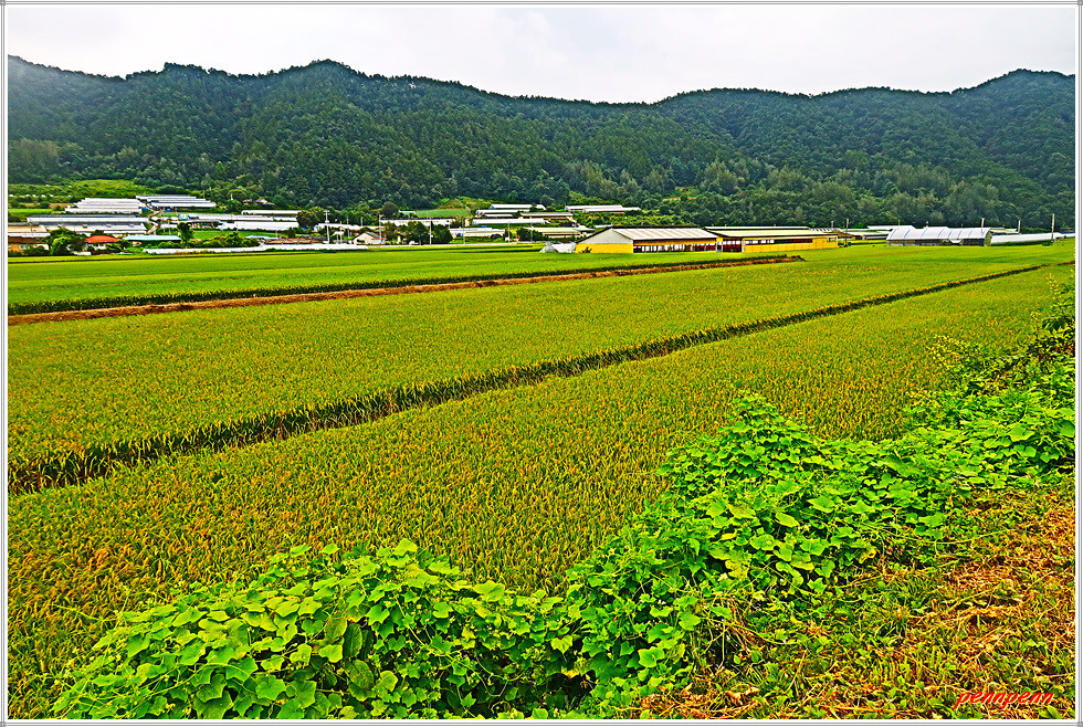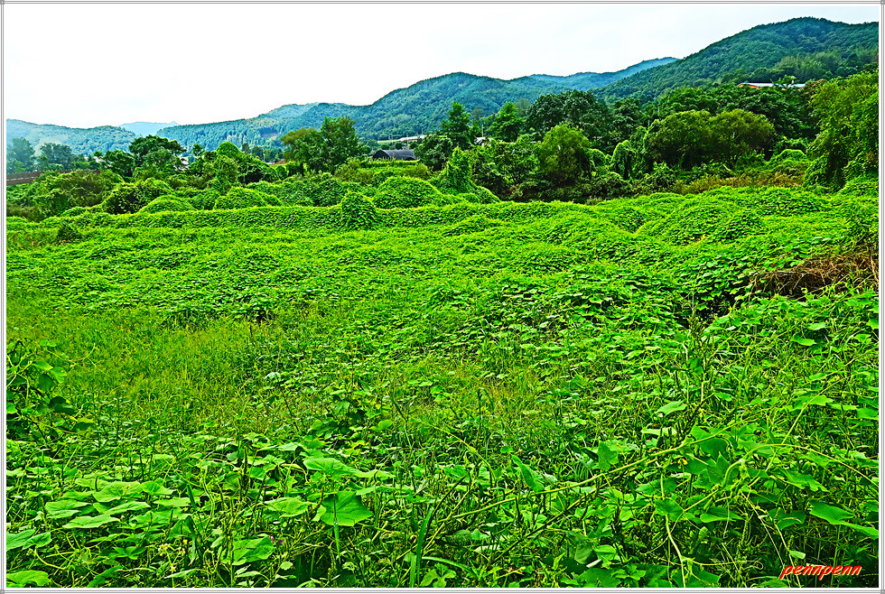여기서 파포천을 따라 남하합니다. 파포천 동쪽 토고미마을에는 넓은 농경지가 조성되어 있어 풍요로운 마을임을 알 수 있습니다. 그런데 파포천의 둔치(고수부지)를 온통 뒤덮고 있는 식물이 보이는데 바로 가시박입니다. 가시박은 북미 원산의 귀화식물로 1990년대부터 관찰되기 시작하였으며 강둑을 따라 습한 지역에 분포하는데 전국적으로 급속도로 확산되고 있는 생태계교란종이라고 하는군요.