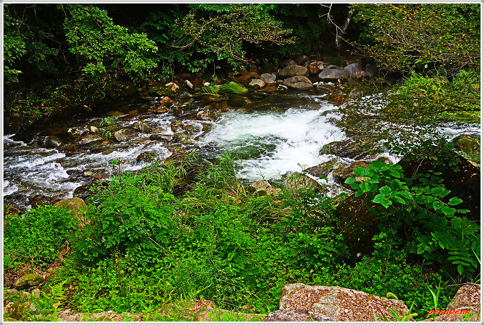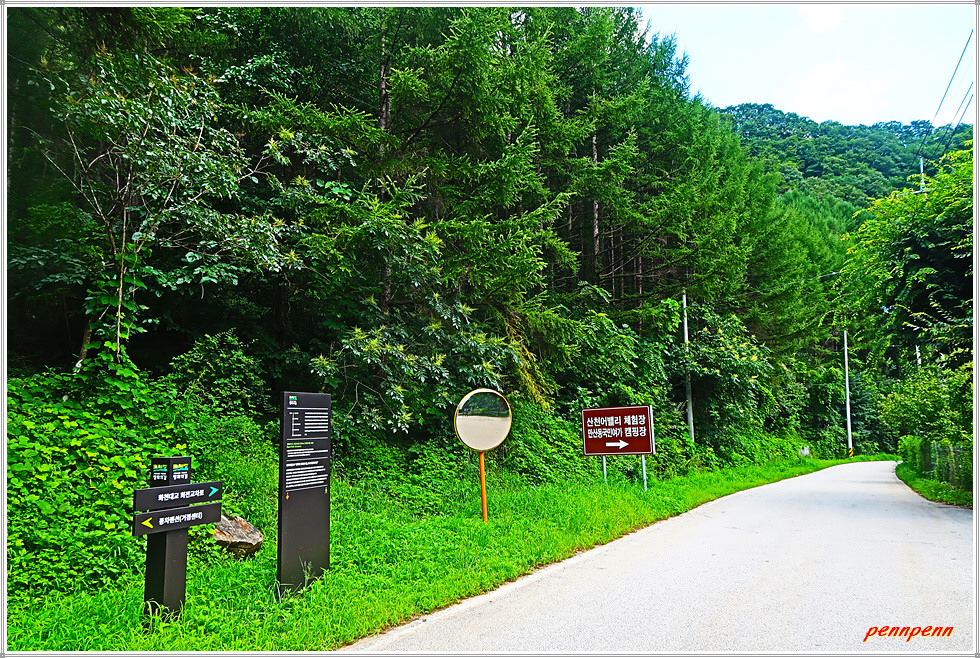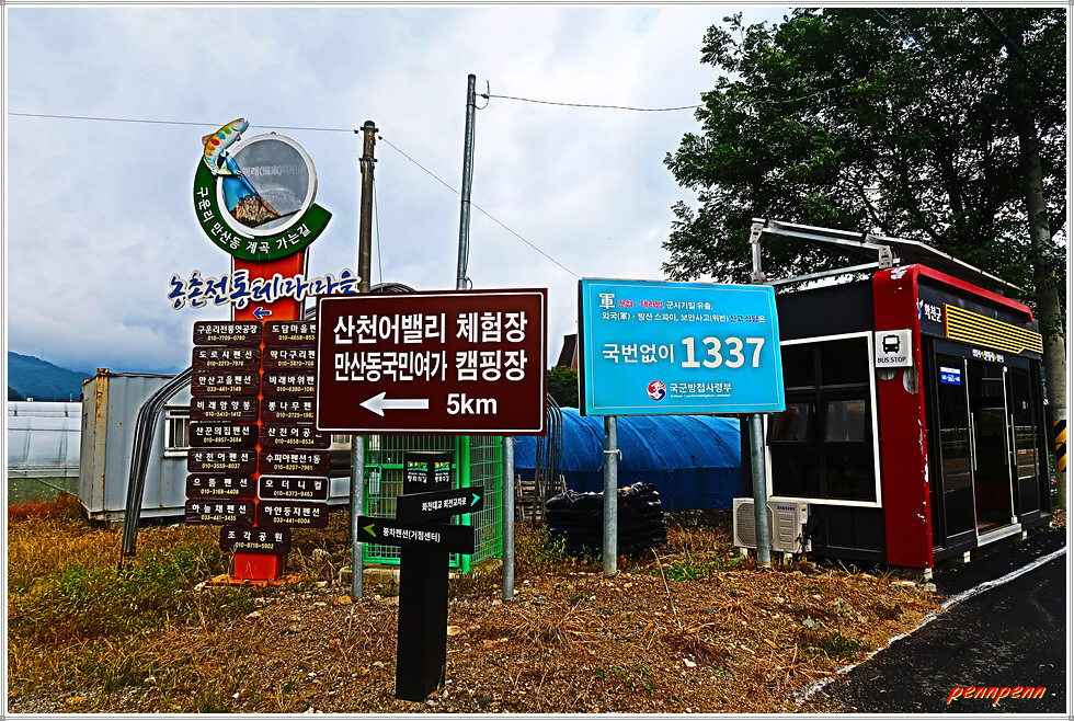 풍차펜션에서 구운천과 나란히 달리는 만산동로를 따라 동남쪽으로 갑니다. 잠시 후 도로 우측에 산천어밸리체험장이 있어 이곳으로 들어섭니다. 화천군 상서면 구운리 소재 산천어밸리는 계곡수와 자연환경이 산천어가 살기에 가장 적합한 환경조건을 갖추고 있어 1급수 청정성을 대표하는 마을입니다. 구운리란 마을 명칭은 9명의 신선이 구름을 타고 내려와 놀던 마을이었다는 전설에서 유래되었으며, 산천어마을에서는 강원도 청정지역의 무농약 오리농쌀과 고추, 콩, 고구마, 감자 등을 생산하고 있습니다.