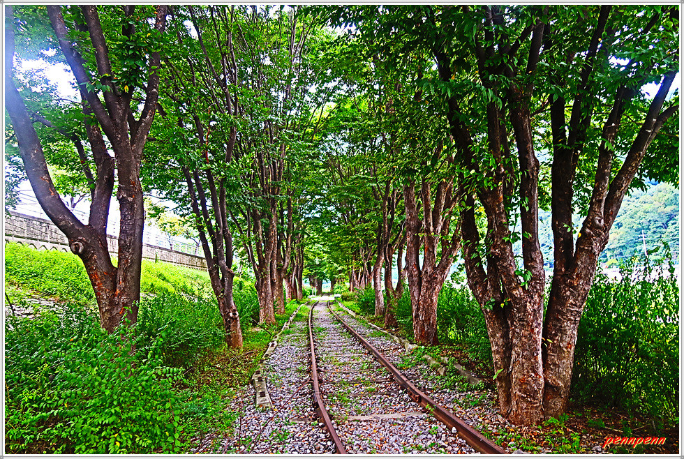 목적지인 화천대교 북단 회전교차로에는 산천어낚시 얼곰이 조형물 타워가 높이 세워져 있는데 길목의 숲에는 철로가 놓여 져 있어 매우 이색적입니다. 북한강을 가로지르는 화천대교는 화천읍 회전교차로에서 남쪽 화천군 화남면을 남북으로 이어주는 대교입니다. 따라서 여행자들은 화천대교와 이웃한 화천교(화천천의 최남단을 가로지르는 다리)를 혼동해서는 안 됩니다. “화천대교 회전교차로”에는 종을 엎어 놓은 듯한 조형물 아래에 여러 동물의 조각품이 놓여 있고 그 옆 북한강변에는 동화 속에서 봄직한 각종 조형물이 설치되어 있어 사진명소로 손색이 없어 보입니다.