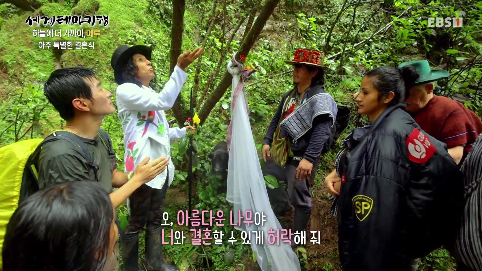 길을 가다가 결혼식장으로 가는 일행을 만나 폭포 쪽으로 함께 갑니다. 길을 가면서 대지의 신에게 허락을 구한 다음 깊은 숲 계곡의 드라고나(용)폭포에 도착합니다. 그런데 신부가 현지의 나무라고 하는군요. 나무에게 면사포를 씌운 후 신랑도 예복을 입고 기도합니다. 신랑은 아마존의 파괴를 막기 위해 이런 의식을 치른다는군요. 배우인 신랑은 전 세계 31개국을 방문해 나무보호를 설파한 인물입니다.