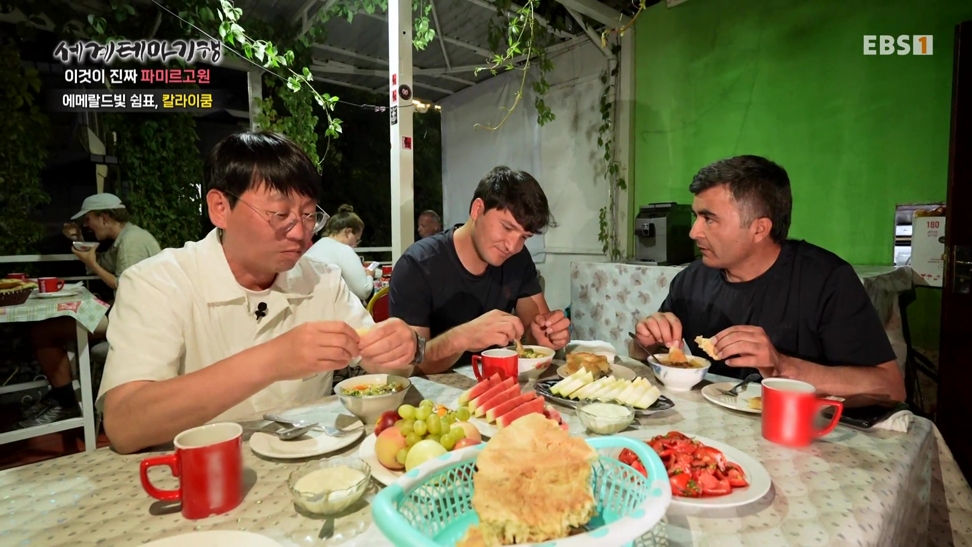 비사브 마을은 절벽에 둘러싸인 옛 요새의 흔적이 있는 마을입니다. 마을주민은 생면부지의 취재진에게 맛있는 차와 다과를 대접하네요. 전통악기 류밥을 만드는 장인은 이 나라 최고의 예술인으로 상을 받았답니다. 수도 두산베로 돌아옵니다. 오쉬(양고기 또는 쇠고기)는 이곳 시민들이 즐겨먹는 대표 요리 겸 국민음식입니다.