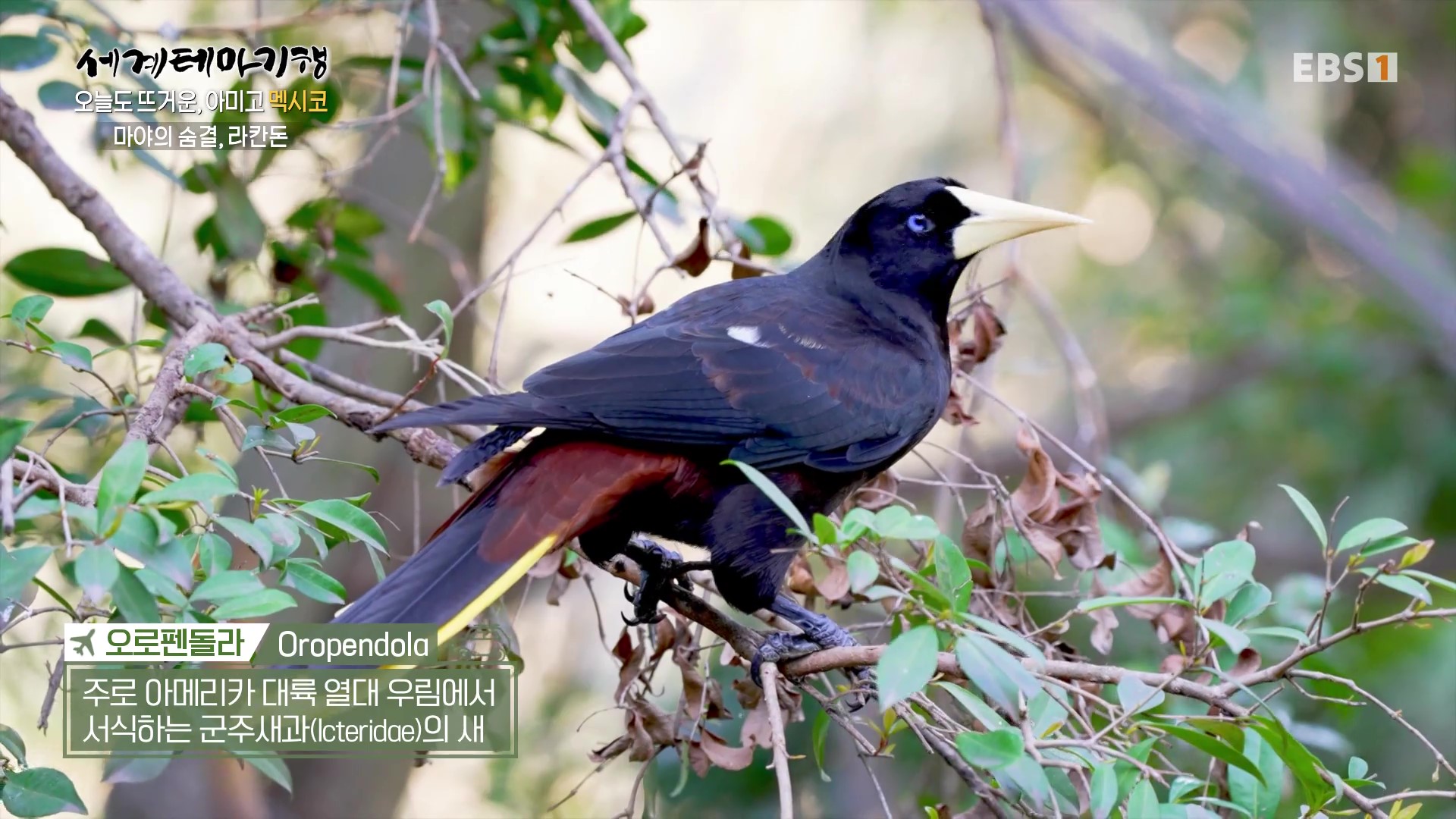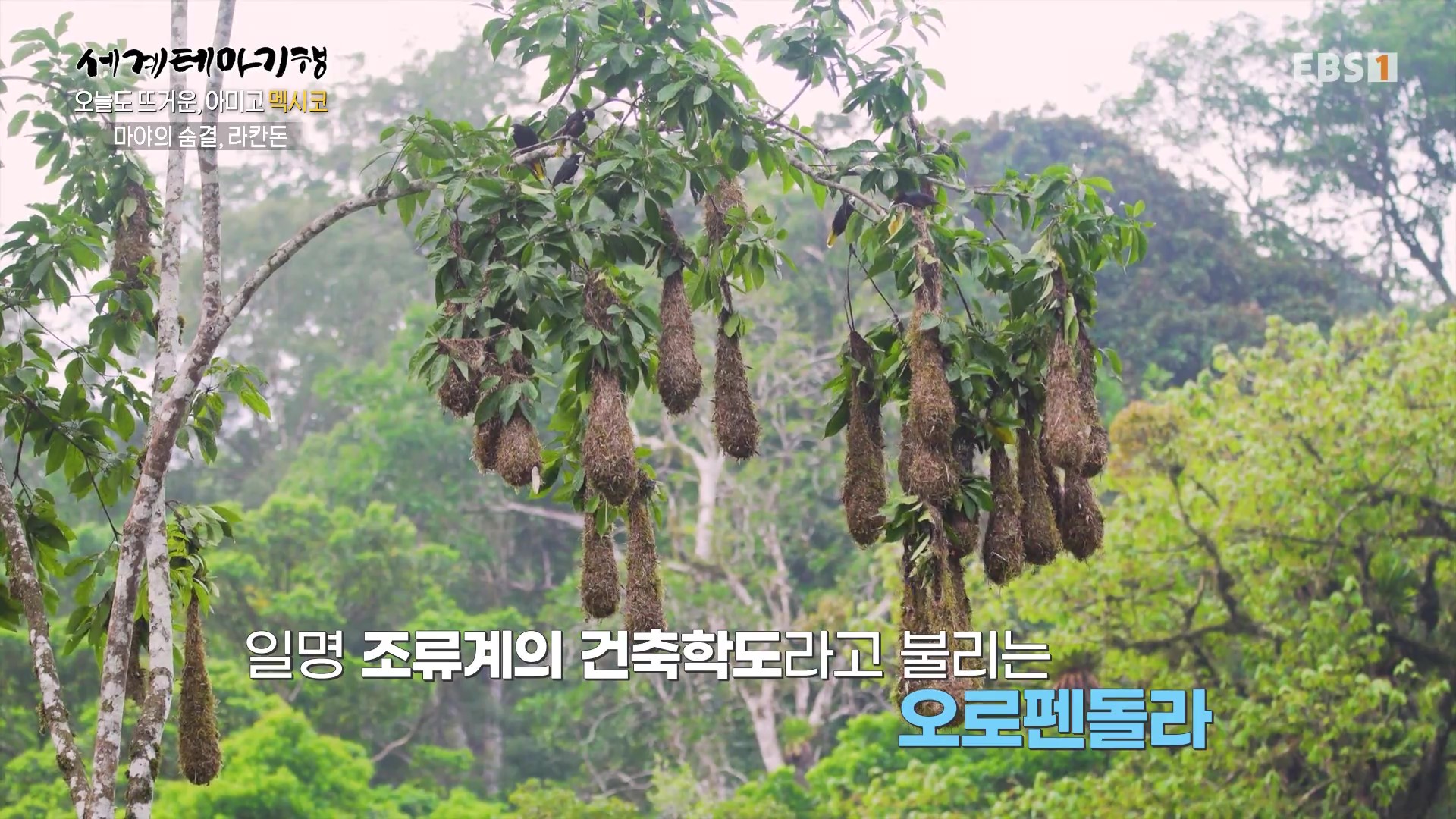 멕시코 남동부 치아파스에 있는 팔렌케는 열대우림인 라칸톤 정글에 있는 미야유적지입니다. 라칸톤 정글에는 16세기 스페인의 식민통치를 피해 숨어들어온 마야의 후손들(약 1,000명 정도)이 살고 있습니다. 오로펜돌라라는 이름의 새는 조롱박 같은 둥지를 매달아 놓는 게 특징입니다. 마야인 가이드 빅토로의 정글 집을 방문했습니다. 음식은 바나나 잎으로 음식재료를 싸서 화덕에 올려 굽는 방식으로 요리합니다. 옥수수가루 반죽에 닭고기를 넣어 구은 것인데 자극적인 맛이 전혀 없어 당황한 메뉴입니다.