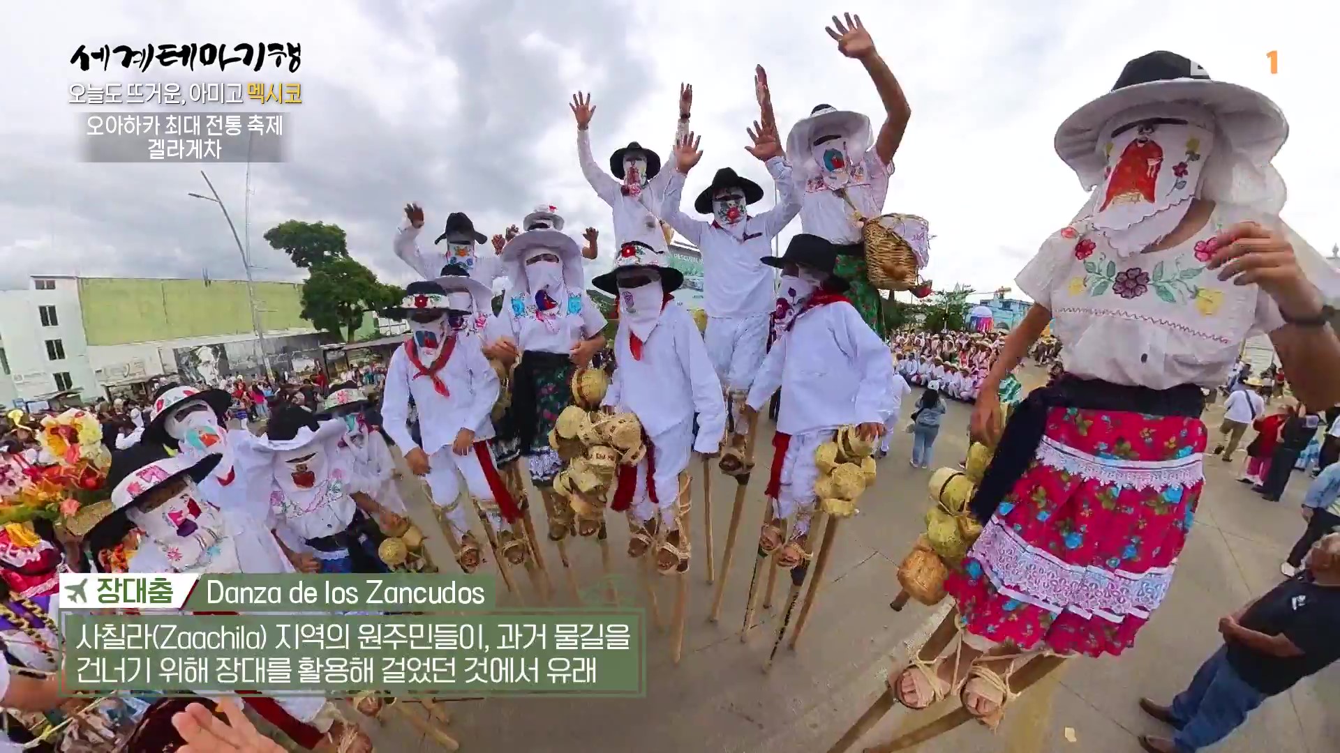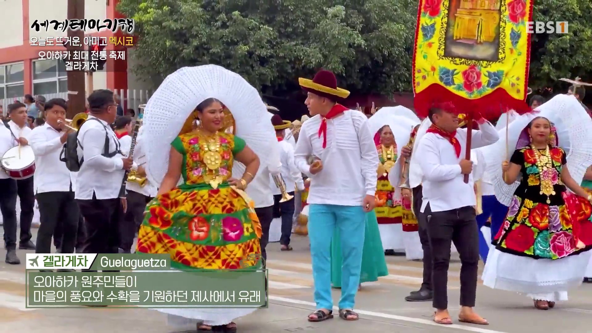 오아하카는 원주민 인구가 가장 많은 지역으로 현재 멕시코에서 가장 큰 겔라게차 축제가 2주간 열리고 있습니다. 축제 퍼레이드에는 무용수뿐만 아니라 다양한 인형과 장식품이 등장합니다. 각지의 마을에서 선보이는 춤이 저마다 독특합니다. 술과 음식을 나누는 문화가 정겹습니다.