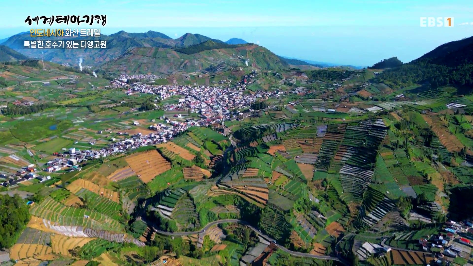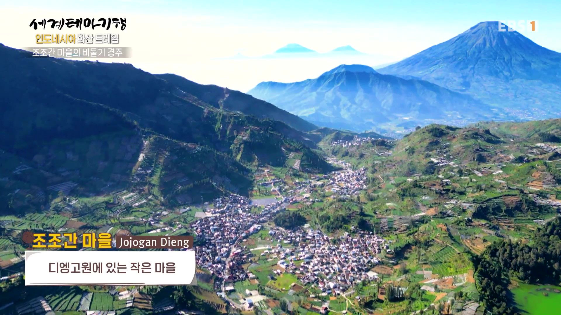 화산활동으로 형성된 디엥고원은 호수와 분화구 및 온천 등 해발고도 2,000m에 펼쳐진 신비의 경관으로 유명한 고원입니다. 디엥고원 전망대(바투 판당 라타판 앙인)에 오르면 색상이 다른 두 개의 화산호수가 보입니다. 조조간마을은 두 개의 호수 옆에 있는 작은 마을로 계단식 밭이 아름답습니다. 마침 감자수확을 하는 농부를 만났는데 지렁이가 자랄 정도로 비옥한 땅이어서 농작물이 잘 자랍니다.