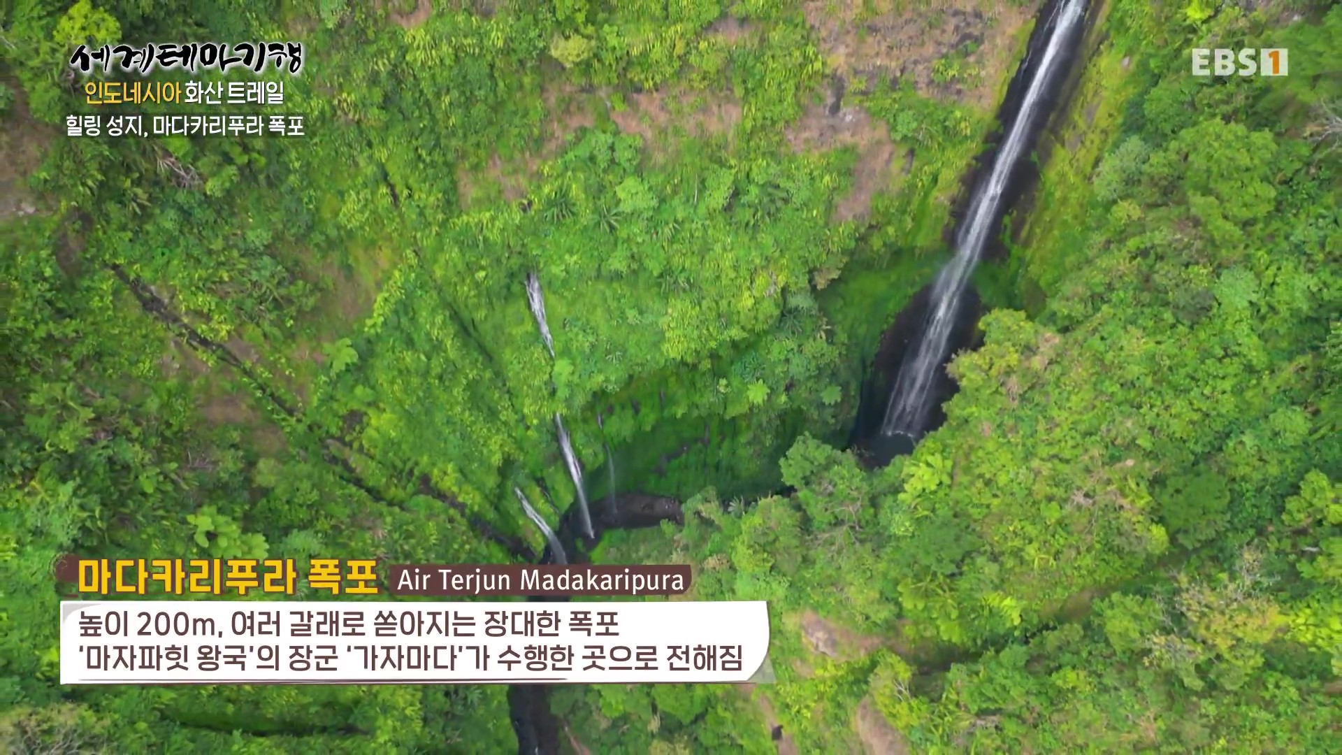 자바섬 브로모 산맥의 끝자락에 있는 마다카리푸라 폭포는 여러 갈래로 쏟아지는 장대한 폭포로 높이가 200m에 달합니다. 유명한 지도자가 이곳에 숨어들어 생을 마감했다고 하여 “성스러운 은신처”로도 불리는 폭포입니다. 폭포수 아래에서 수영을 즐기다보면 이곳은 바로 비밀의 천국입니다.